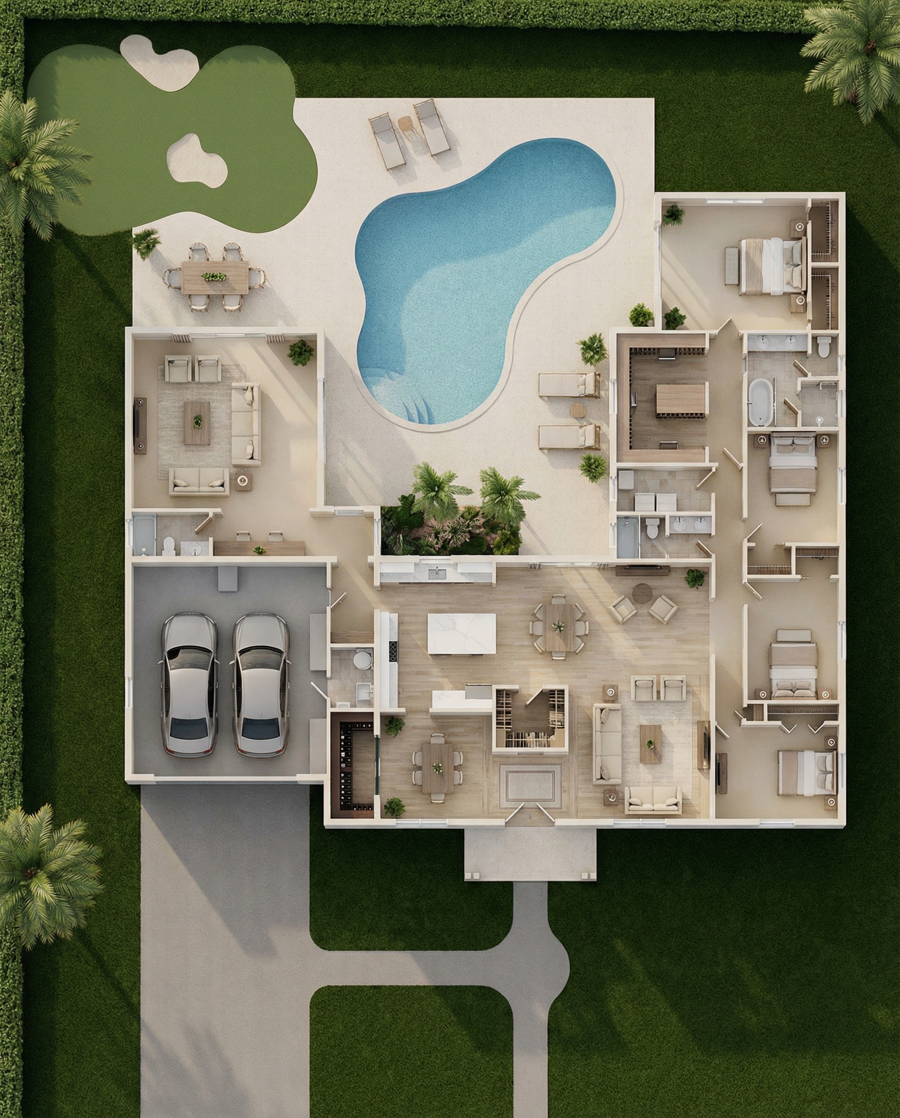 white lap siding throughout with white board and batton roof peaks black roof in forest with a side loaded driveway