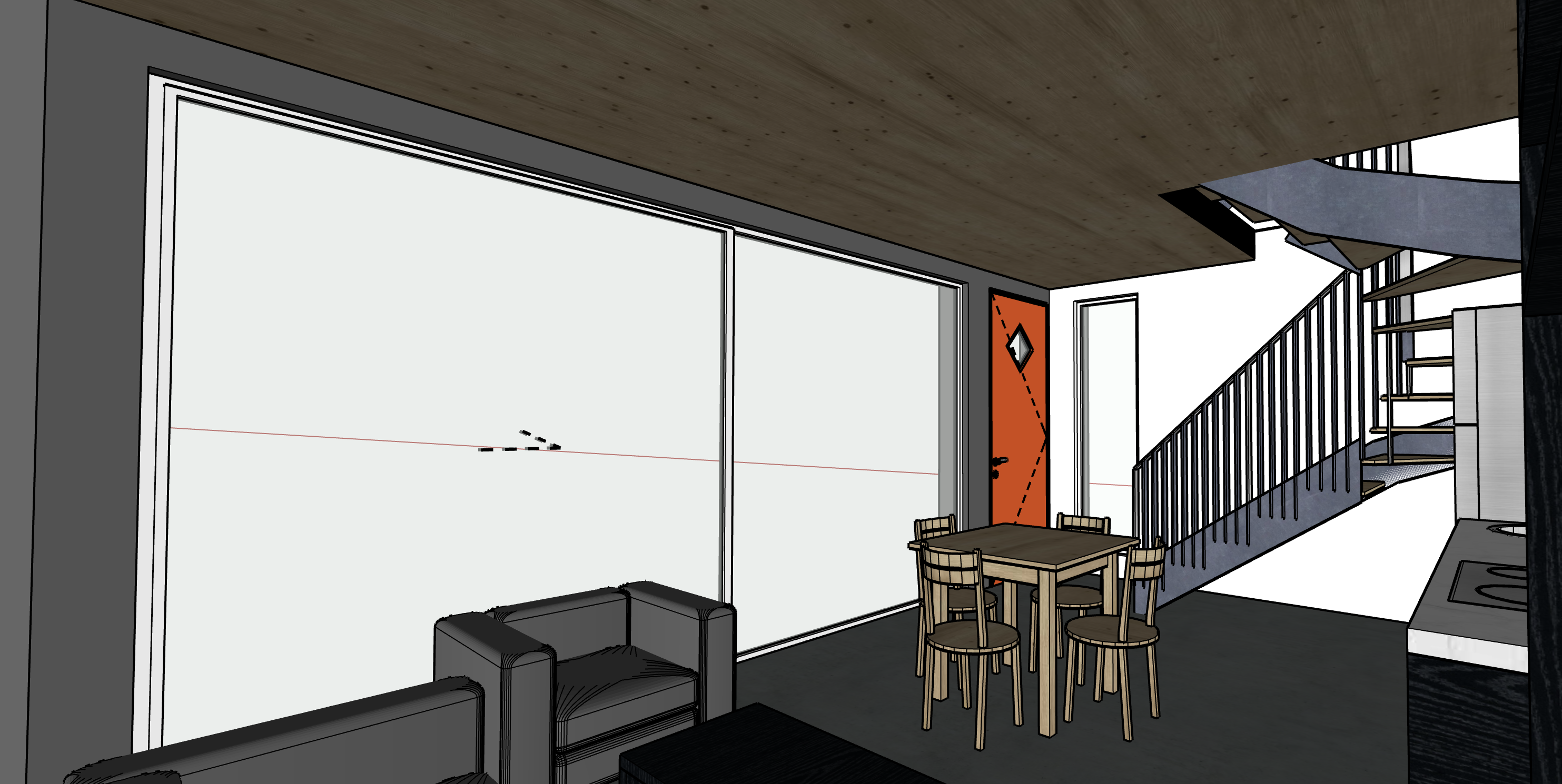 photorealistic modern interior floor to ceiling glazing opening to a private courtyard garden warm timber ceiling polished concrete floor natural daylight soft global illumination realistic materials high end architectural photography