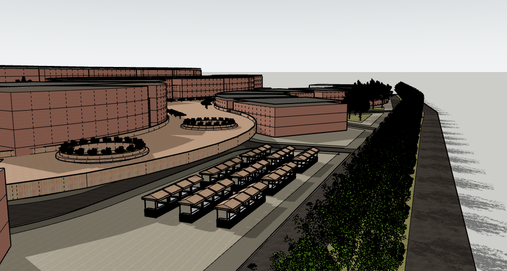 photorealistic aerial architectural render from an existing sketchup 3d city model asphalt areas remain vehicular roads only the elevated pedestrian boulevard between the front buildings is wooden decking not a road preserve the wood material texture and treat it as a pedestrian only space add a modern building design facade do not add any cars vehicles or traffic elements add pedestrians and bycicles correctly scaled to buildings and street width walking and gathering on sidewalks and on the wooden pedestrian boulevard reduce actual scale of pedestrians and increses size of trees maintain accurate urban scale realistic human proportions correct spacing no overcrowding buildings retain original massing proportions and placement use natural daylight soft realistic shadows and professional architectural visualization quality add lots of urgban vegetaction and trees