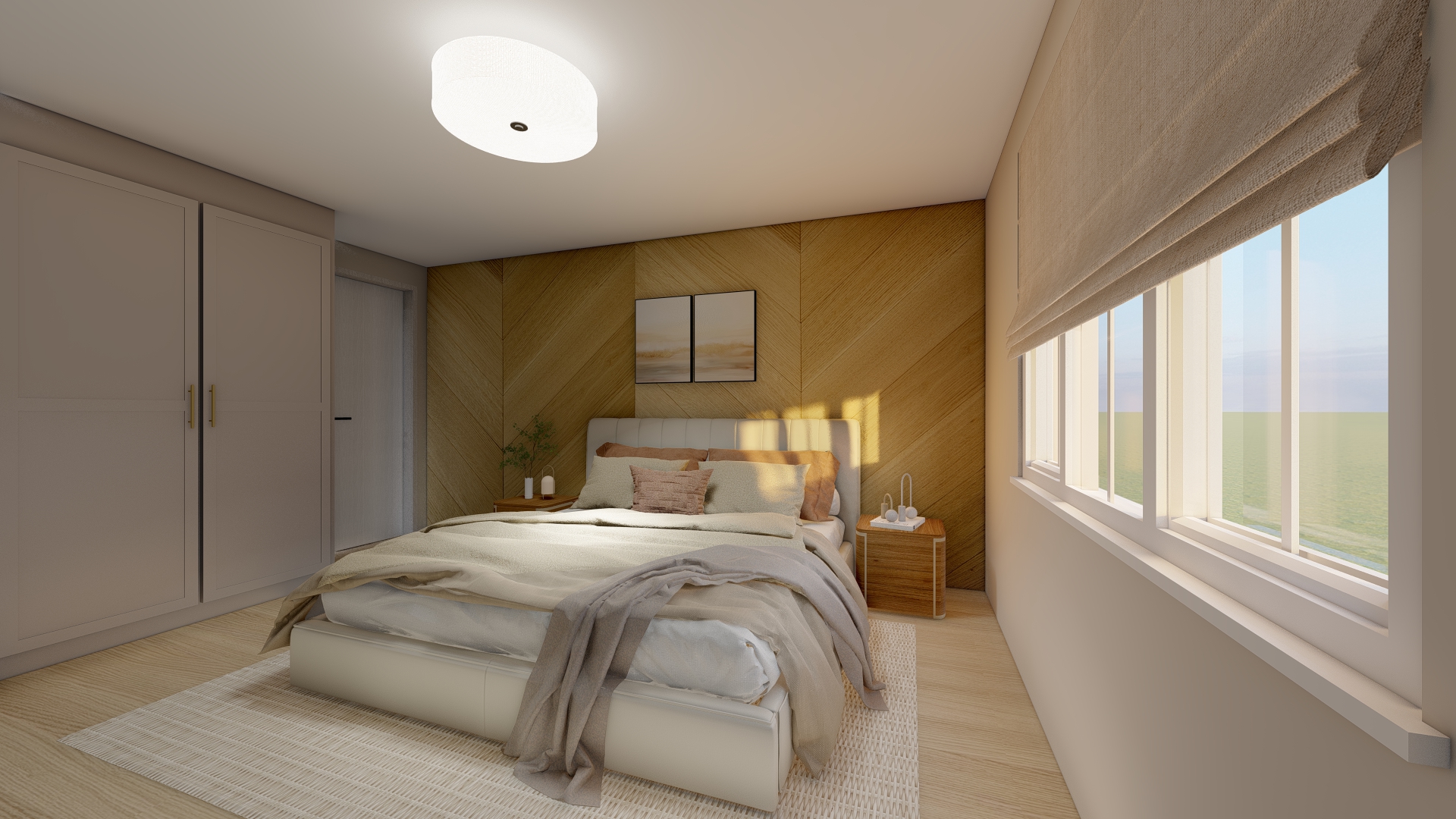 transform this bedroom photo into an ultra realistic rendering while preserving the exact layout proportions and furniture placement enhance all materials and textures with high definition detail including the padded headboard layered bedding wooden nightstands chevron accent wall wardrobe surfaces and window shades emphasize natural lighting from the large windows creating soft shadows and warm highlights across the room maintain the modern warm minimalist style with organic elements and faithfully reproduce all decorative details such as framed artwork plants lamps textiles and accessories elevate color accuracy depth and realism ensuring a polished elegant and cohesive final image that reflects a contemporary serene interior