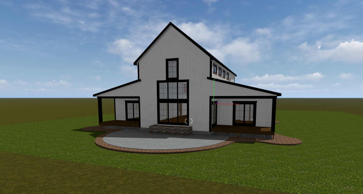 make as photorealistic as possible while keeping textures the same as selection professional landscaping in a lightly wooded scene with good lighting match materials to plan and remove any text white siding white trim windows black solid front door