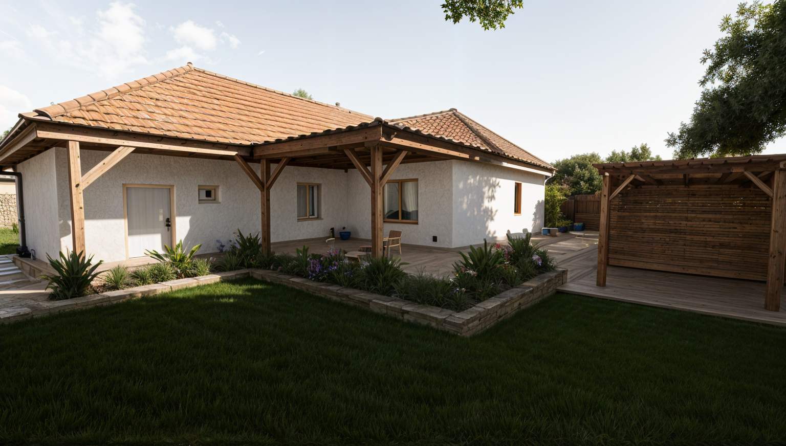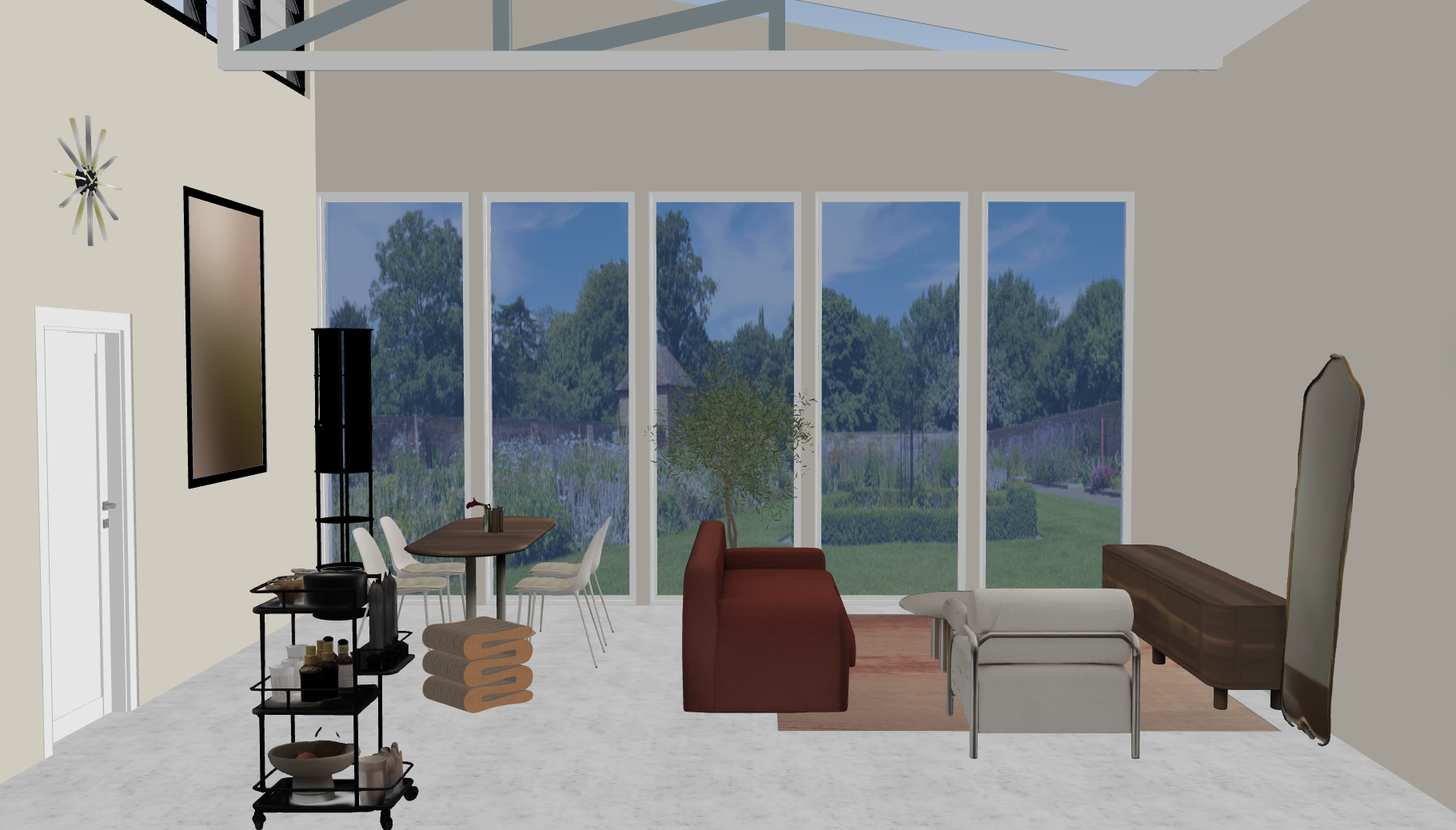 a contemporary living and dining space with large windows over looking a private garden keep all furnishings exactly the same and to scale the floors are polished concrete leave the rug and the ceiling beams are dark grey wood do not change anything only add a black ceramic vase to the sideboard