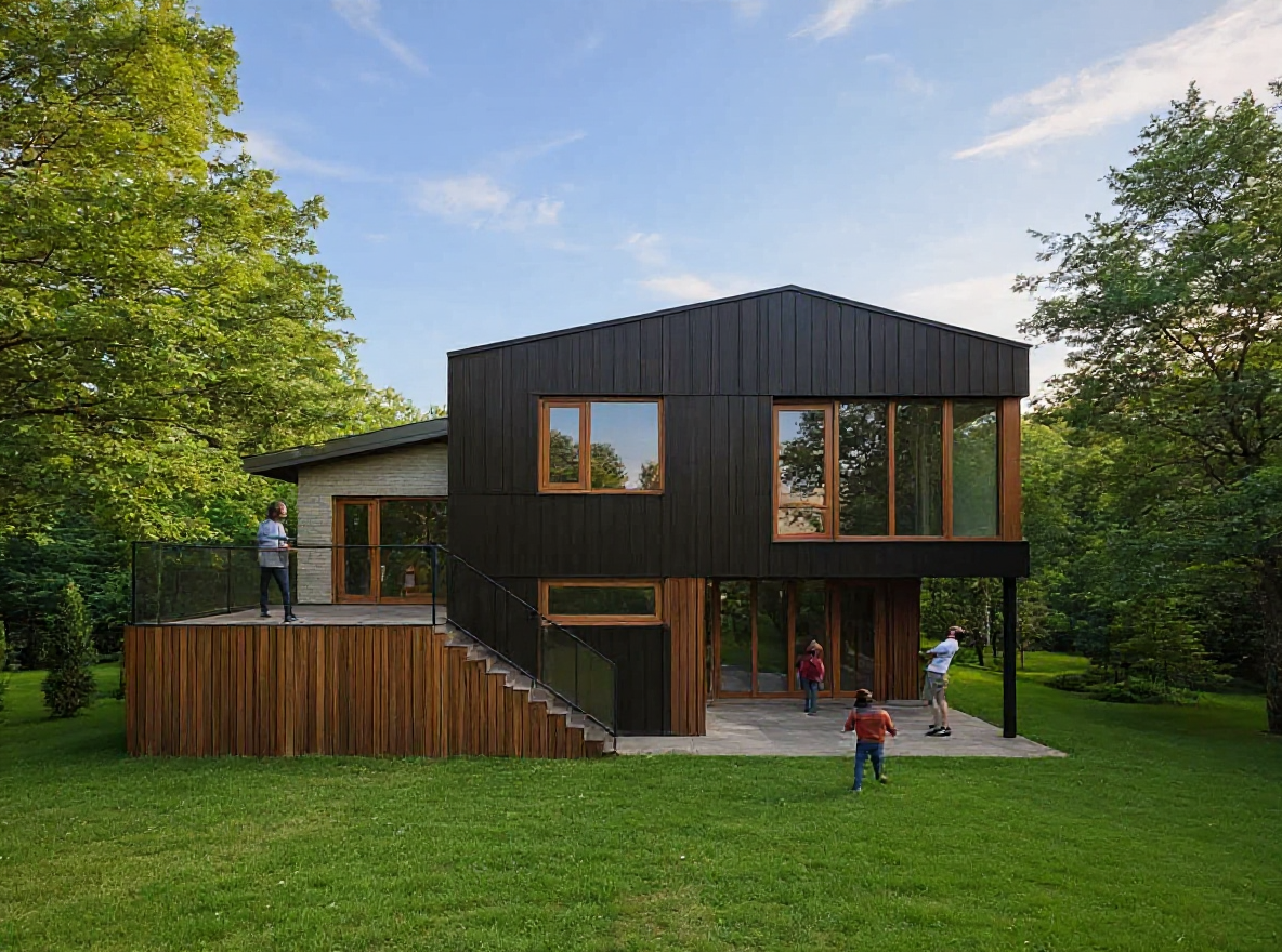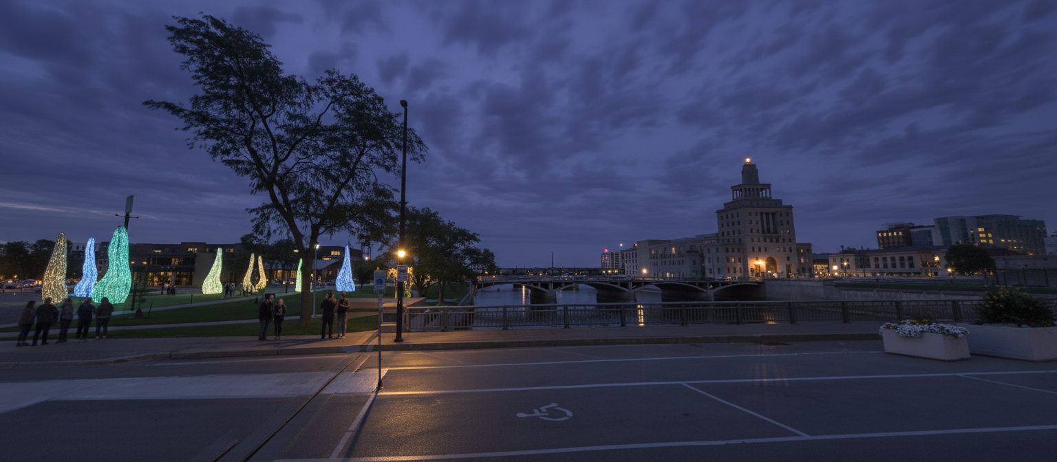make a dark evening scene on the left side only in the lawn areas add large light sculptures in the green lawn spaces add people