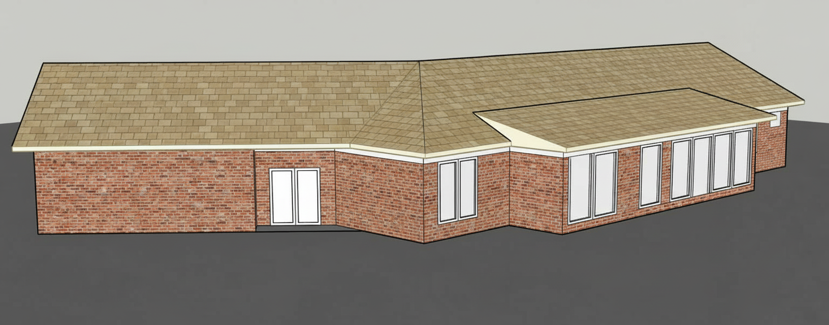 exterior shot roof to be more on the pinkish side to blend better with the red antique brick