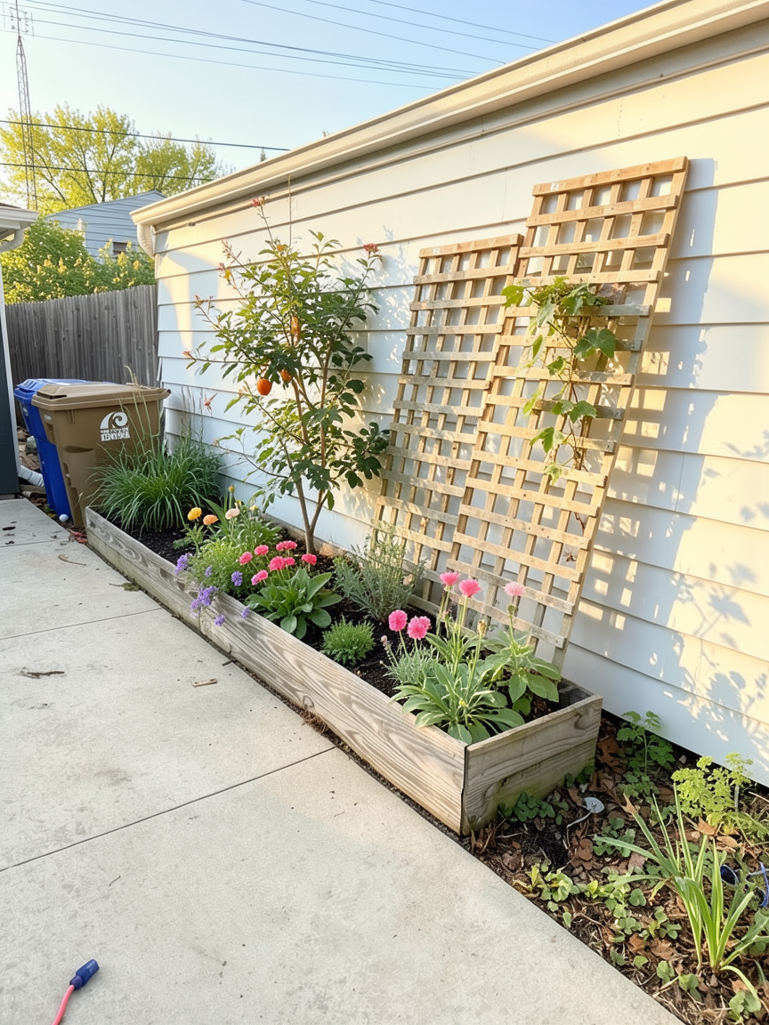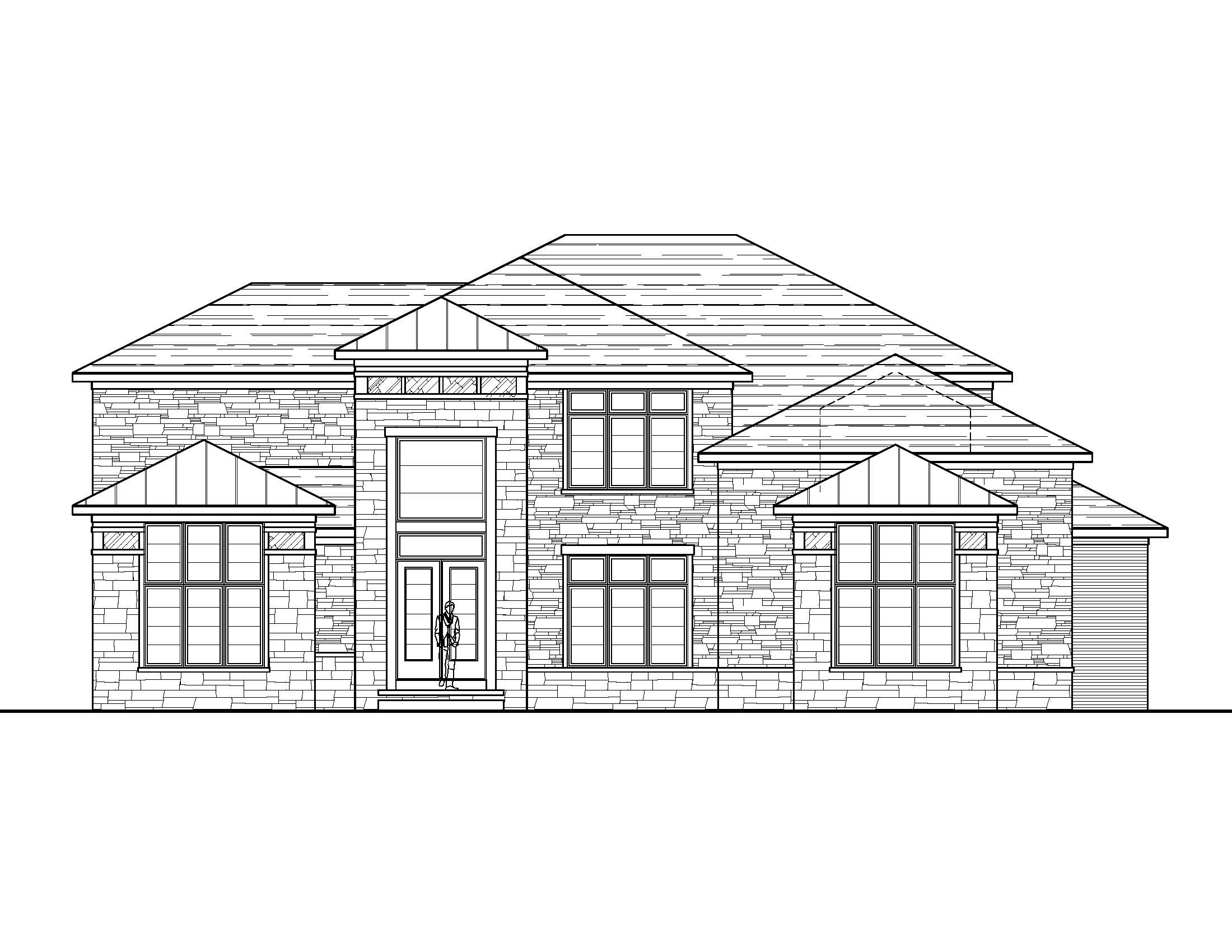 6pm evening a modern two story house with a sleek design and hip roofs light to medium sand colored earthtone stone surrounds the entry and base the roof is a dark charcoal color adding contrast large windows dominate the facade reflecting the clear blue sky the front and garage doors are very dark stained wood surrounding the house a lush green lawn with colorful flower beds in shades of pink lavender and yellow lansdcape stones dot the yard framing plantings the atmosphere is serene and welcoming with evening sunlight casting gentle shadows do not modify the massing as shown add large tree in foreground