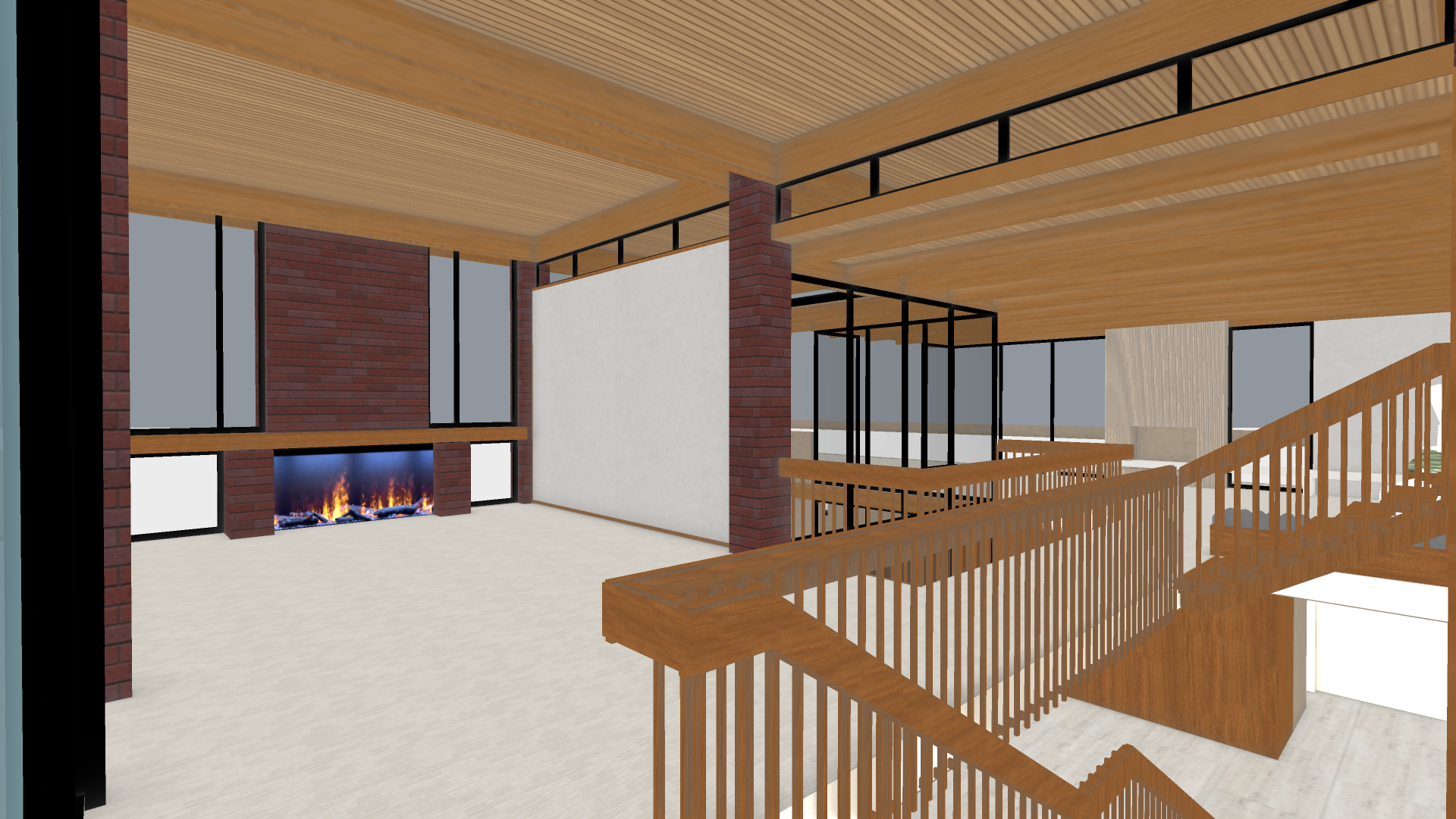 render a photorealistic 3d perspective of this mid century modern masterpiece house in a los angeles ca keep model geometry the same windows doors roof walls do not change the view change the floor tp view cut travertine stone add staked sheer drapes to windows add sunlight and a vibrant clear sky with light atmospheric depth render in hyper realistic architectural visualization quality 8k resolution
