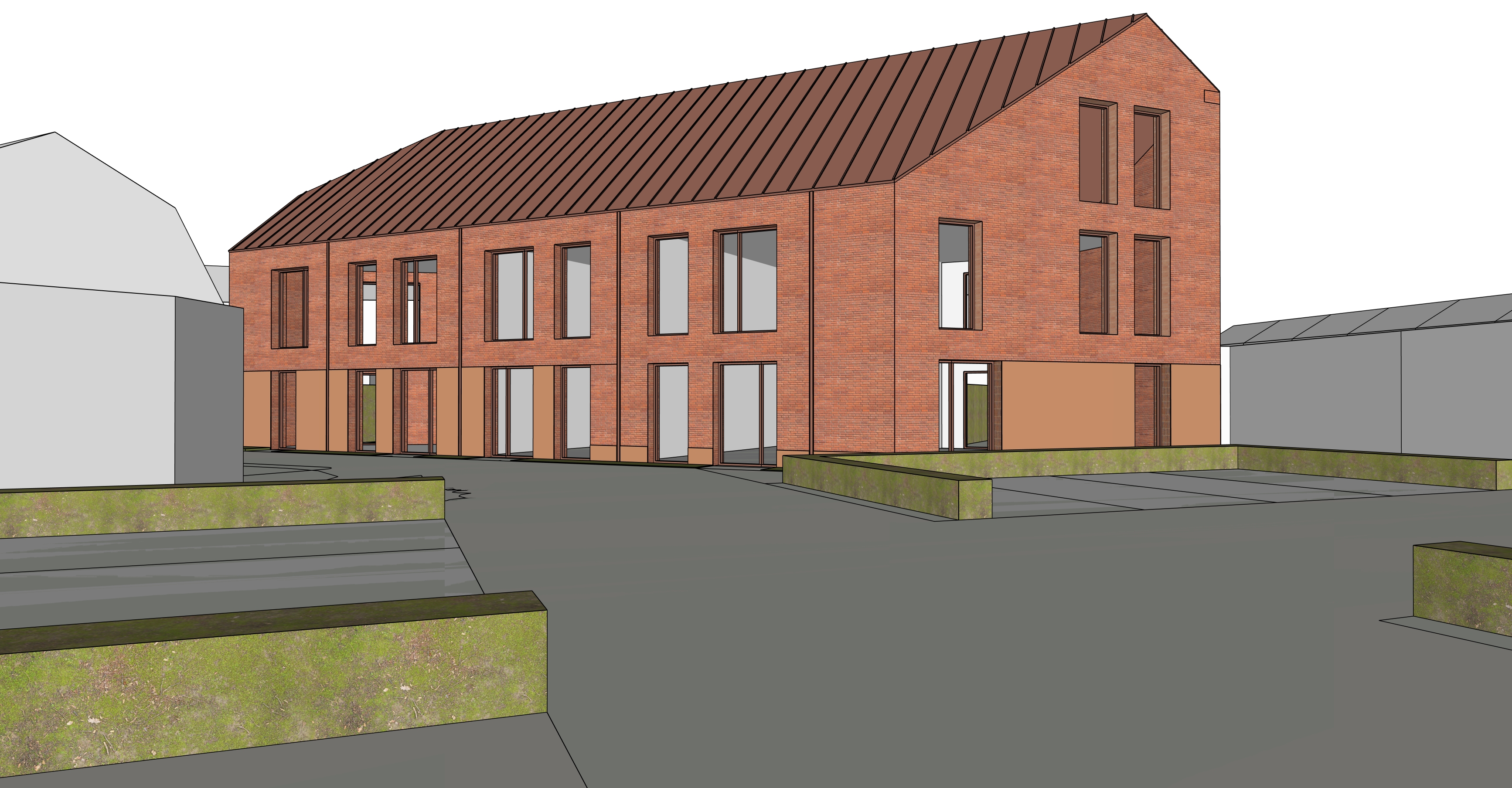 create a warm and inviting residential courtyard scene inspired by contemporary dutch architecture the main buildings should feature fa ades made of red brown mottled brick and window frames in an orange red brown tone the roof detailing must consist of vertical panels in a red brown color with a matte weathered texture adjacent buildings may appear more abstract while still maintaining a sense of neighborhood cohesion and should be entirely bright white with large glass areas to create contrast between the sidewalk and the bottom edge of the window frames include a trasraam plinth made of pigmented concrete in the same color as the window frames place softly draped partially open white curtains behind the glass to add a sense of residential warmth and interior depth depict an autumn like day in the netherlands with soft slightly diffused daylight and gentle warm tones with the sun positioned later in the afternoon on the right side of the scene include a green tree with autumn foliage in front of the buildings on the left side of the street in front of the last building add an additional tree behind the main building add five tall beech trees to create a natural backdrop include a parking area with a few cars and surround each parking space with a hedge approximately 50 cm high in front of the building add small garden areas with grass and flowering plants to enhance the residential character include a pedestrian sidewalk and use traditional dutch style brick pavers for the street surface add subtle landscaping and a few people walking or cycling to create a calm community oriented atmosphere