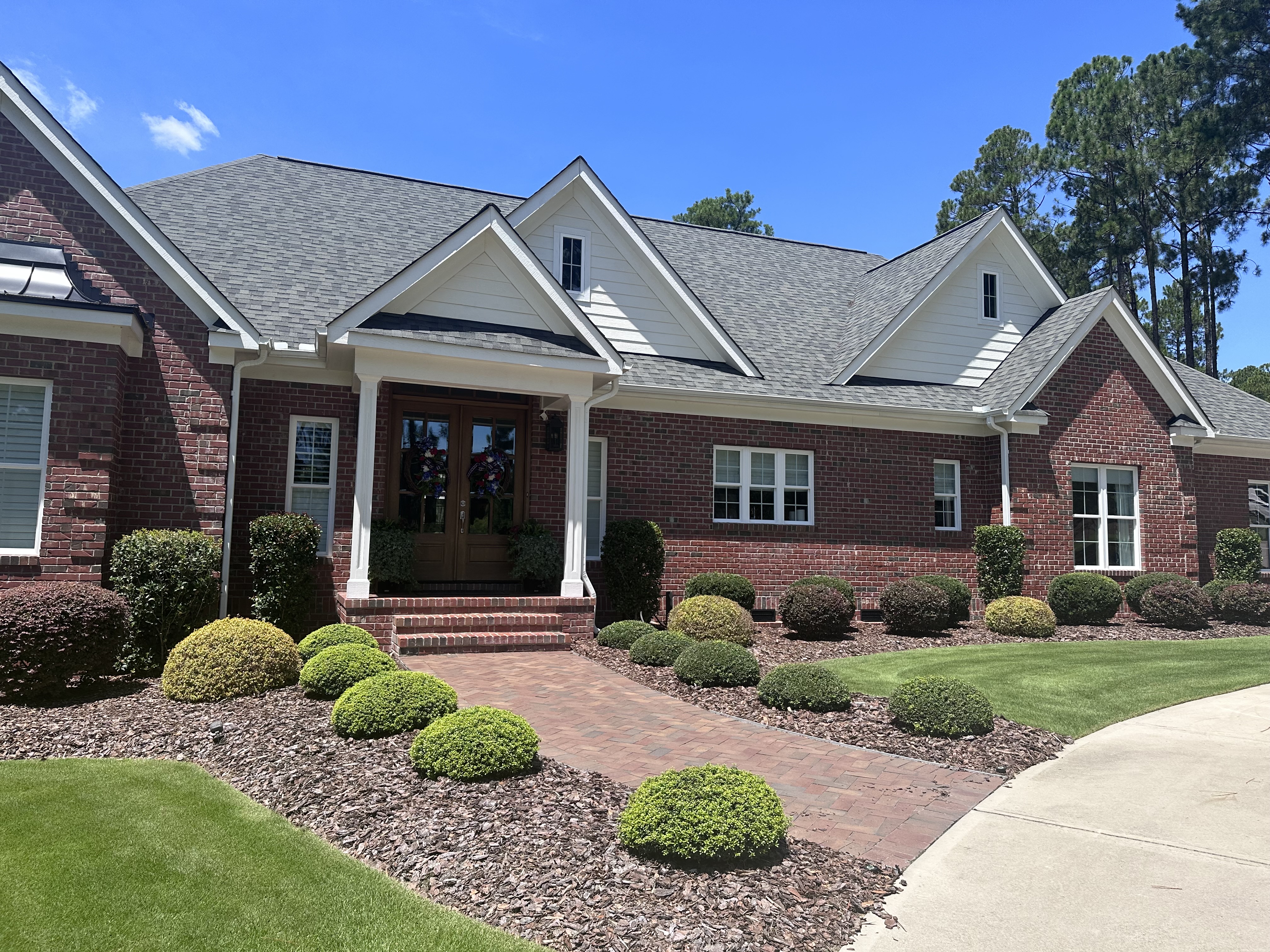 we need to keep this image structurally the same however add dark taupe shutters to the larger center window and the window on the far right of the house