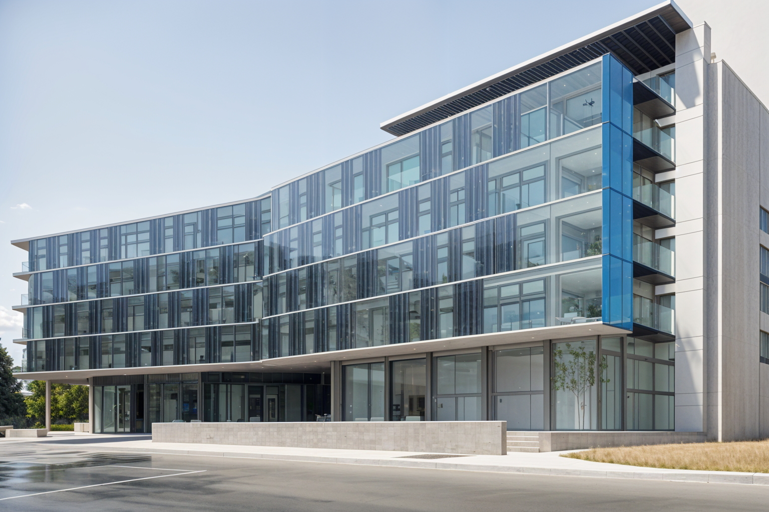 big bjarke ingels group exterior shot a modern five story building with a dynamic wave like facade the structure uses a combination of clear glass and sleek metal panels each floor featuring alternating horizontal and vertical patterns render the building with reflective blue tinted glass windows and light grey aluminum panels the roofline and exterior beams should be a contrasting white set in a vibrant urban setting with a clear blue sky during the golden hour casting warm sunlight and soft shadows add greenery around the base with small trees and shrubs for a lively atmosphere architecture