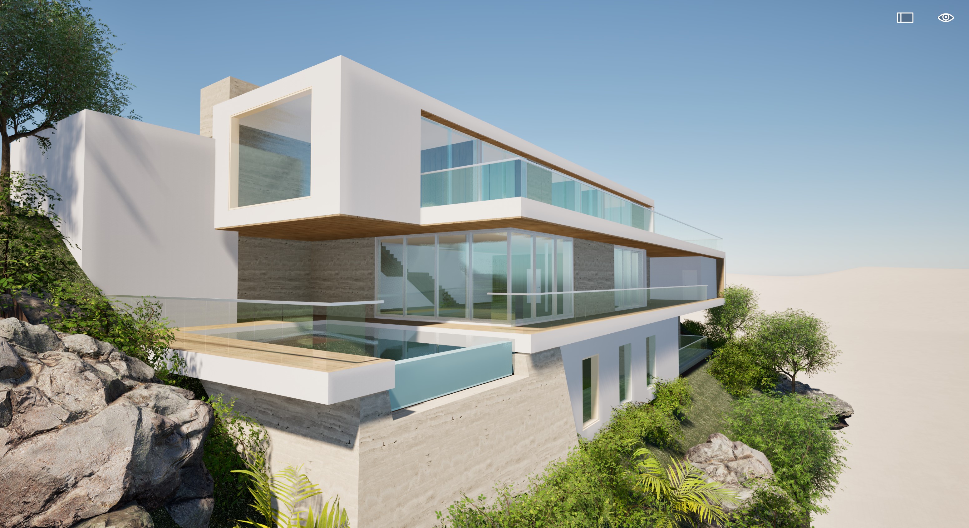 a modern house in pacific palisades ca with smooth white plaster finish brushed aluminum sliding glass door frames and smooth travertine stone accents with frameless glass railings on a hill with grass and olive bushes surrounding the building overlooking the pacific ocean