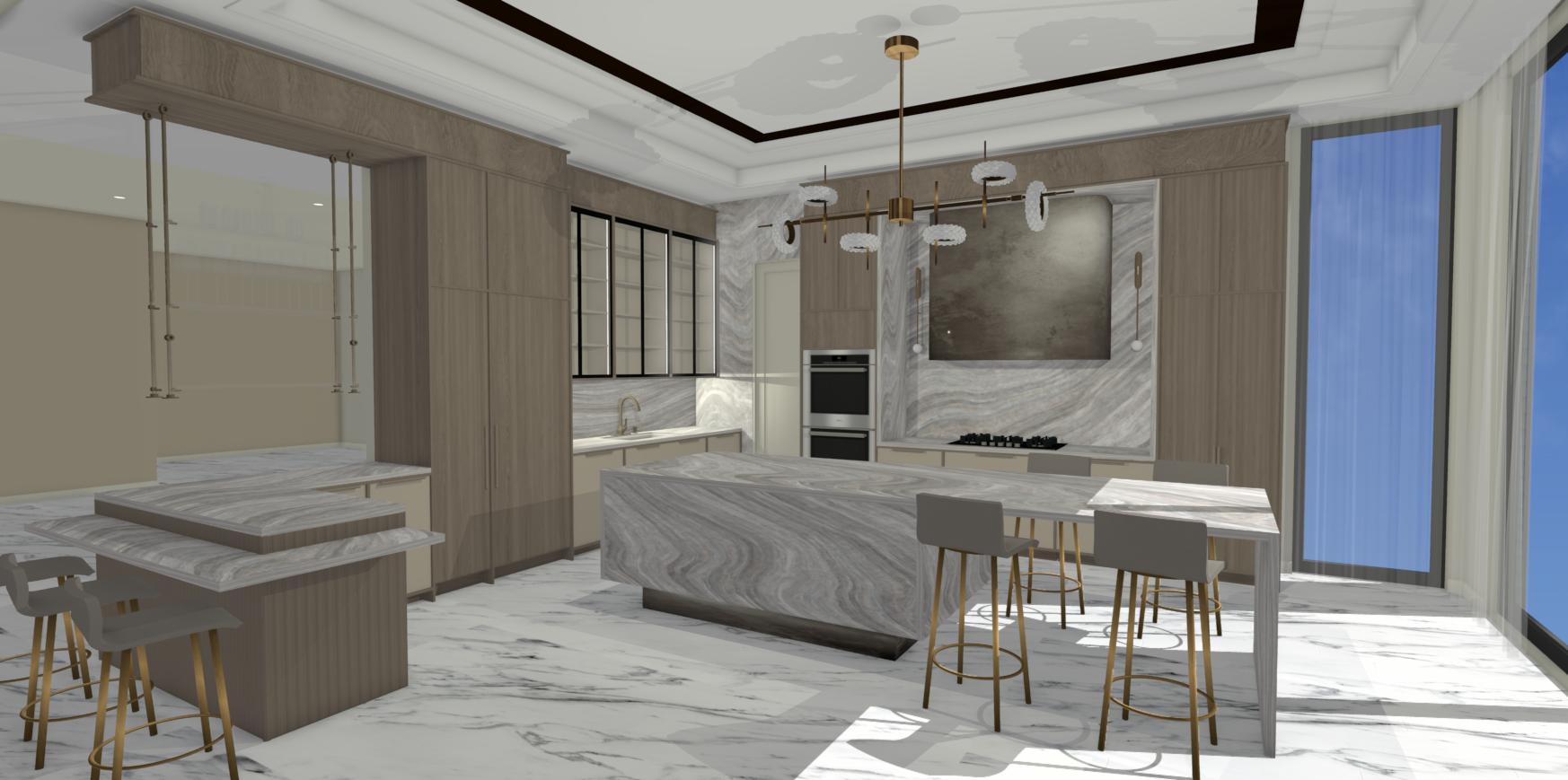 ultra photorealistic high end interior render of a modern luxury kitchen strictly keep the original design layout camera angle proportions cabinet style island shape ceiling details windows and all architectural elements exactly the same as the reference image no redesign no changes in structure no repositioning of any element enhance only materials lighting and realism to a premium level cabinets maintain existing design finish in a refined combination of matte wood texture and matte agt sshara cream soft touch surfaces with subtle realistic reflections countertop backsplash full height bookmatched slab stone option 1 calacatta gold marble with bold elegant veining option 2 dramatic dark marble nero marquina style with high contrast veins seamless waterfall edges on island hood brushed metal finish champagne tone clean minimal slightly reflective surface lighting continuous warm led strip under all base cabinets toe kick lighting soft glow reflecting on floor soft indirect ceiling lighting realistic chandelier glow warm tone 3000k natural daylight from windows with soft shadows material realism physically accurate materials pbr subtle imperfections micro scratches natural variation in stone and wood grain soft reflections on polished marble floor atmosphere cinematic lighting balanced exposure global illumination ray tracing soft shadows ambient occlusion slight depth of field for realism render quality ultra high resolution 8k sharp details noise free photorealistic showroom quality final instruction strictly preserve original design no modifications no reinterpretation only material lighting and realism enhancement