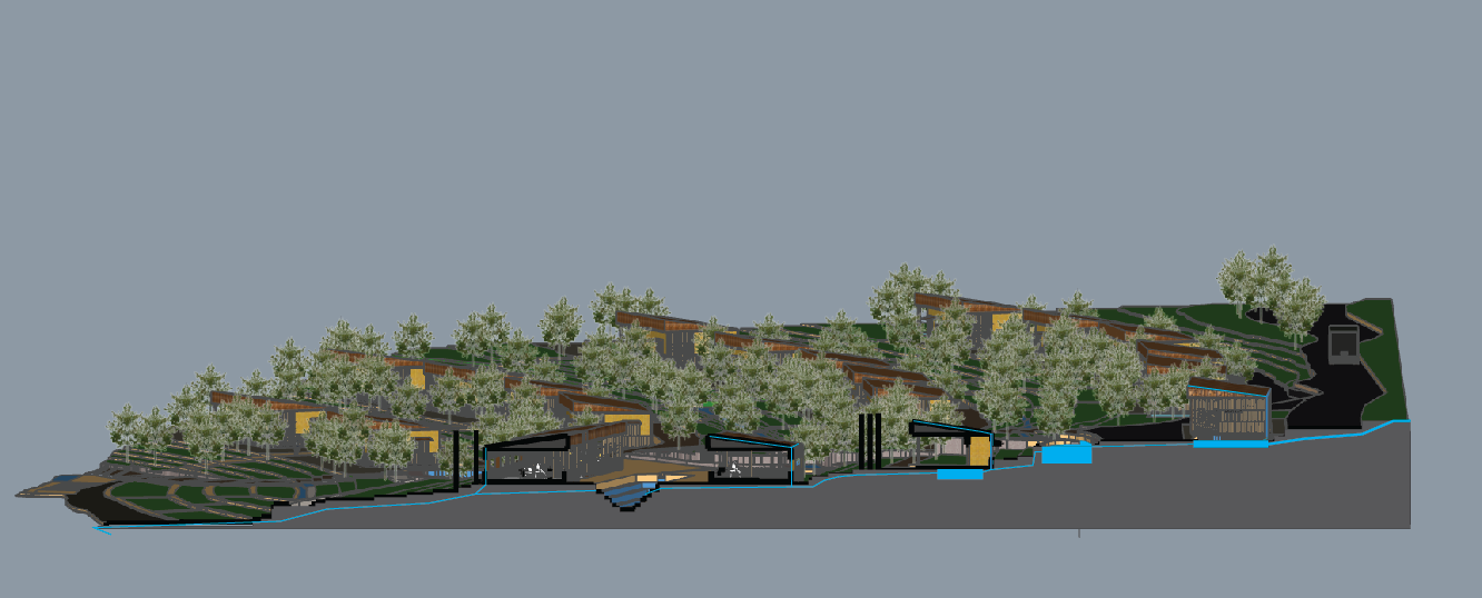 create a minimal architectural site section cut based on a terraced hillside settlement in matupi chin state myanmar show only the essential elements stepped topography simple housing embedded into the slope trees and one clear blue water diagram line the blue line should illustrate rainwater being collected from the roofs of the houses and moving through a gravity fed system along the hillside for storage and community use keep the drawing quiet and clean with very limited diagram overlay no extra arrows no heavy labels and no unnecessary graphic clutter use muted earth tones for land and buildings while the blue water line remains the only strong diagram element the purpose of the water diagram is to express the main thesis idea water is not secondary but a primary organizing system that connects shelter terrain infrastructure and community recovery style should be minimal strong conceptual and thesis board ready