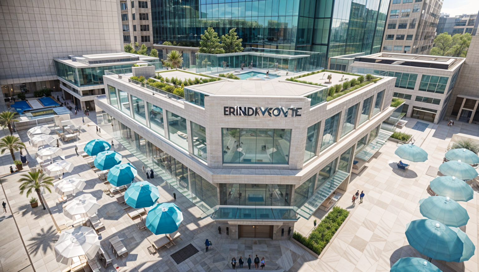 outdoor luxury shopping centre with glass and modern yellow stone details with palm tree landscaping and green roofs in dubai architecture