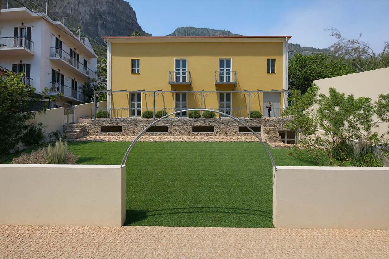 replace the green grass in front with beige pebble