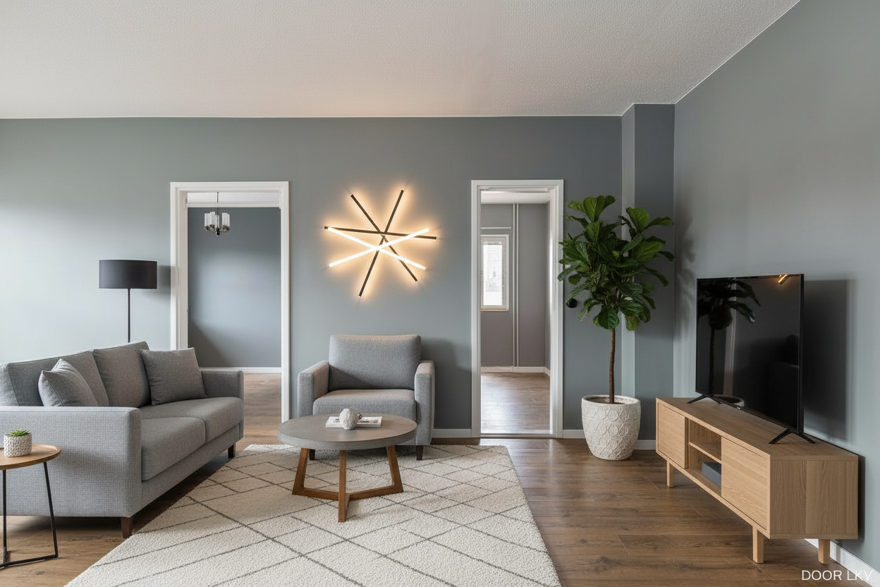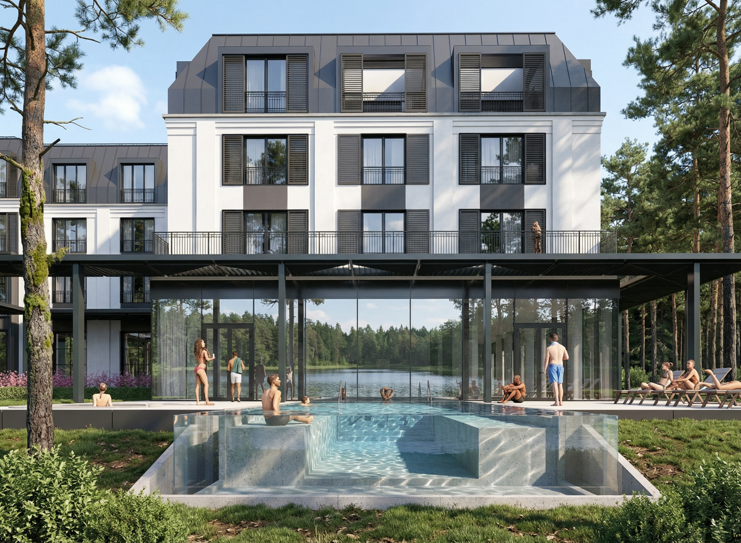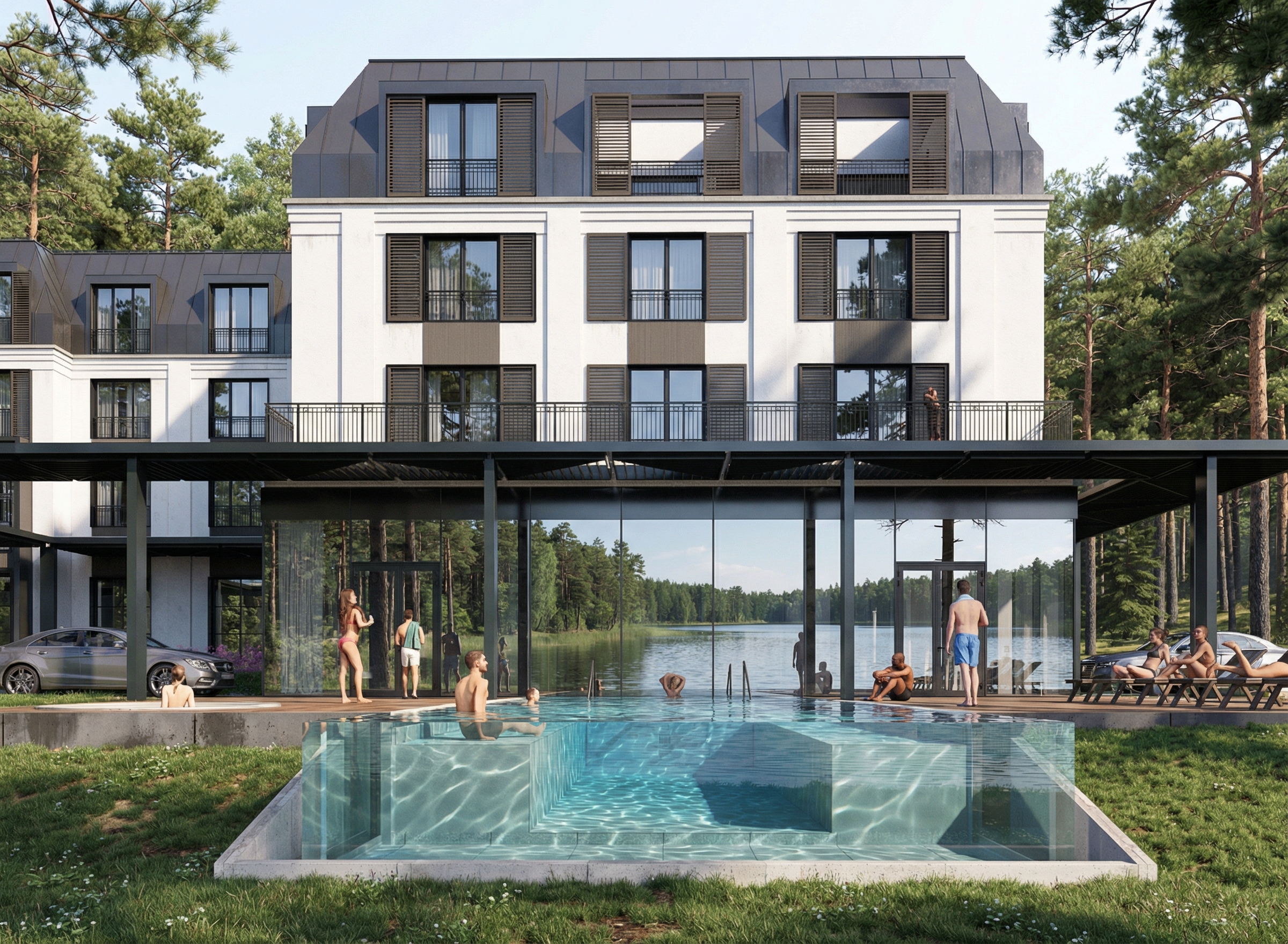 transform this image into a hyper photorealistic architectural visualization replace all non realistic materials with lifelike versions maintaining the dominant color palette add natural subtle sheen and glossy highlights on metals glass wood surfaces create realistic textures on concrete plaster and fabrics with micro details change background to serene lake region surrounded by dense forest enhance surrounding environment to ultra realistic quality while preserving exact structure and shape of bushes trees grass and lake detailed bark textures with moss on trees natural leafy density variation on shrubs short grass blades mixed with soil patches reflective lake surface with gentle ripples realistic water depth and shoreline details preserve natural forest floor under trees as woodland litter and earth leaf litter pine needles moss patches soft brown soil texture blending seamlessly make all cars hyper realistic with accurate brand models natural paint imperfections realistic tire treads chrome reflections subtle dirt and dust accumulation add soft realistic shadows under cars cast on ground and proper environmental reflections on car surfaces add precise environmental reflections in every glass pane capturing surroundings bright high key lighting throughout with even daylight illumination soft natural shadows from vegetation and cars clear blue sky with soft clouds ultra detailed 8k photorealistic render professional architectural photography style