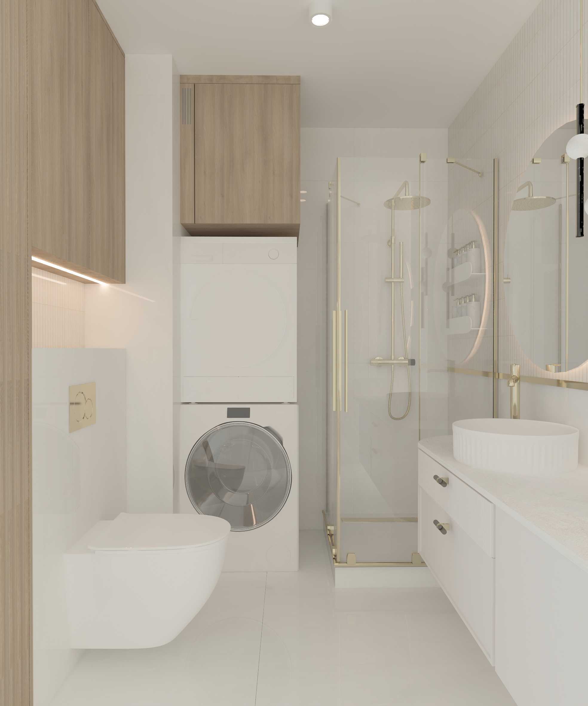 walnut colored cabinets above the built in toilet walnut colored cabinet above the washing machines add bathroom decorations to the countertop by the sink and the open shelf above the toilet improve the lighting
