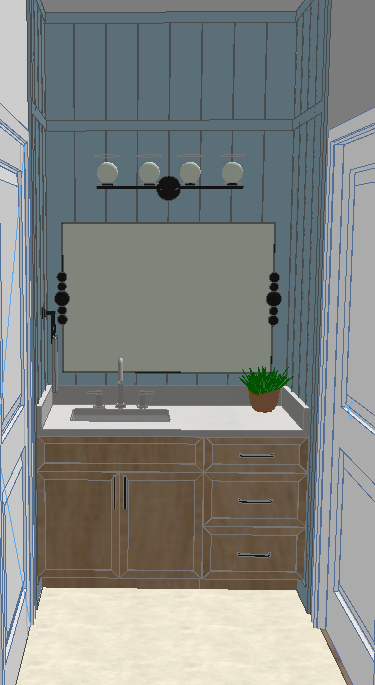 a modern contemporary bathroom design white beige marble tile flooring complements a light mid tone maple wood vanity and a cabinet with matte black handles a light soft blue grey shiplap wall accents the back and side walls with elegant stainless steel fittings completes the design the atmosphere is calm and relaxing accented by lush green planted accessories on the white marble countertops with black vanity light the lighting is soft and natural creating a relaxing spa like atmosphere the mirror trimmed in a slender black frame with rounded accents on either side