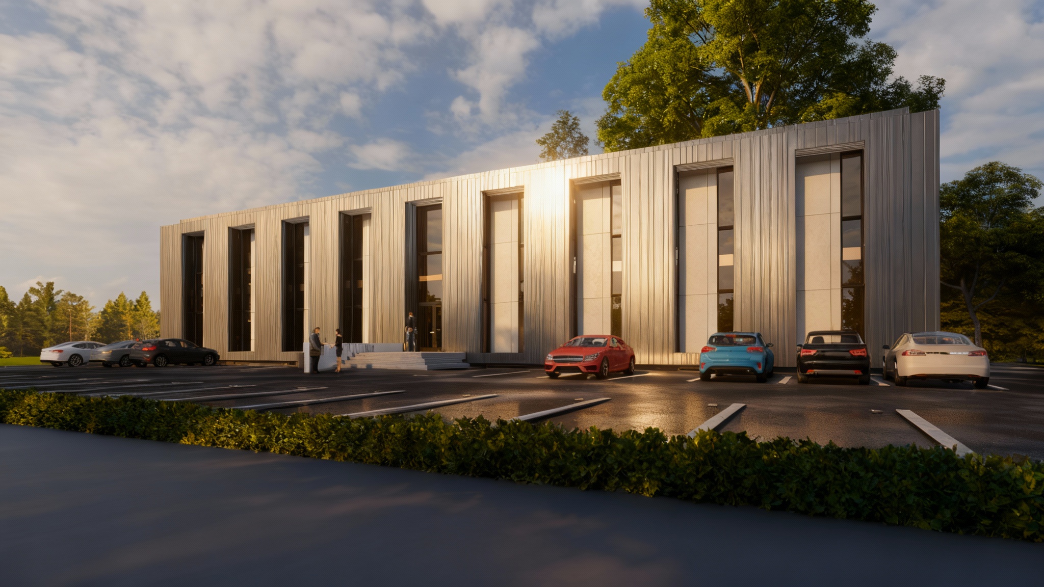 exterior shot following the same concept and materials render a charming tudor style house with elegant black and white timber framing the exterior walls feature a mixture of textured stone and smooth white plaster accentuate the windows and doors with warm rich mahogany surround the house with lush green grass and tall full oak trees the atmosphere is serene and inviting with a gentle golden glow of a late afternoon sun casting soft shadows and highlighting the architectural details beautifully