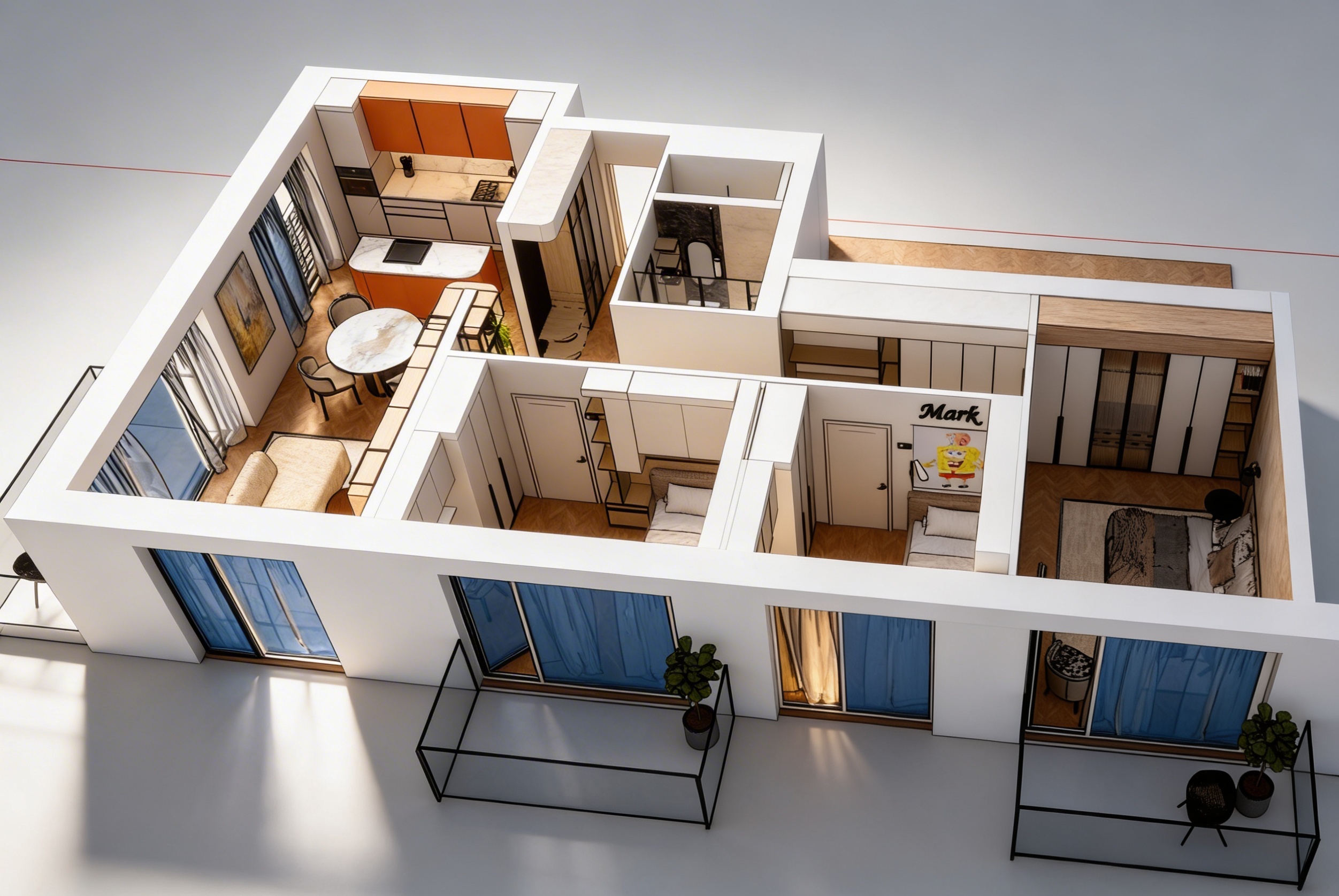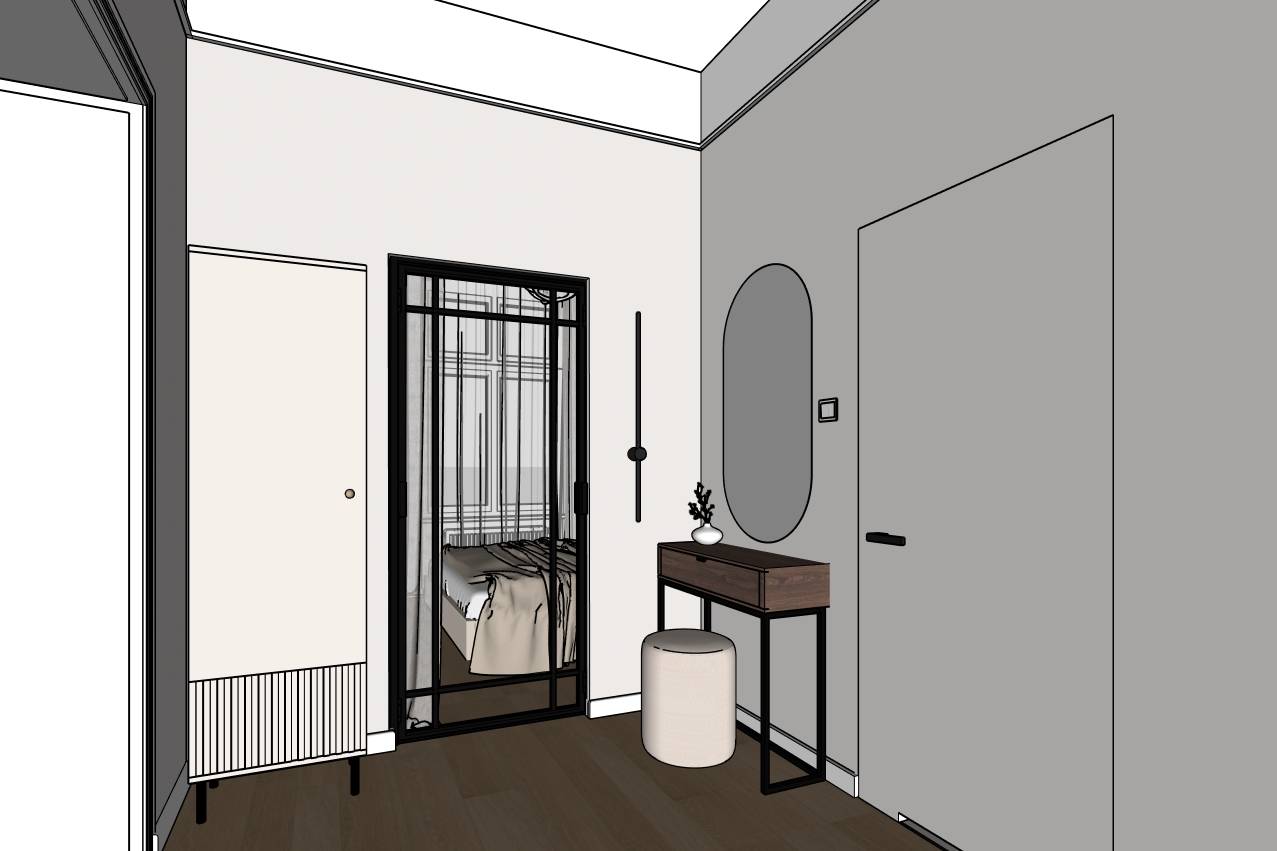 hallway corner in a renovated european pre war apartment no windows warm ambient ceiling light walls white smooth plaster thin flat stucco molding strips forming rectangular panel frames tone on tone white simple horizontal cornice at ceiling junction floor light natural oak wide planks matte finish back wall left black metal framed glass door with grid pattern bedroom visible through glass bed with cream linen bedding sheer curtains next to it white sliding panel with vertical ribbed detail at bottom back wall right oval mirror dark walnut console table on black metal legs white ceramic vase with dried branches black metal vertical wall sconce between glass door and mirror cream round pouf under the console right wall flush hidden door perfectly level with wall no frame no trim no molding same white paint as wall only dark metal handle visible style white walls light oak floor walnut and black metal accents cream textiles warm minimal elegant photorealistic warm lighting eye level camera