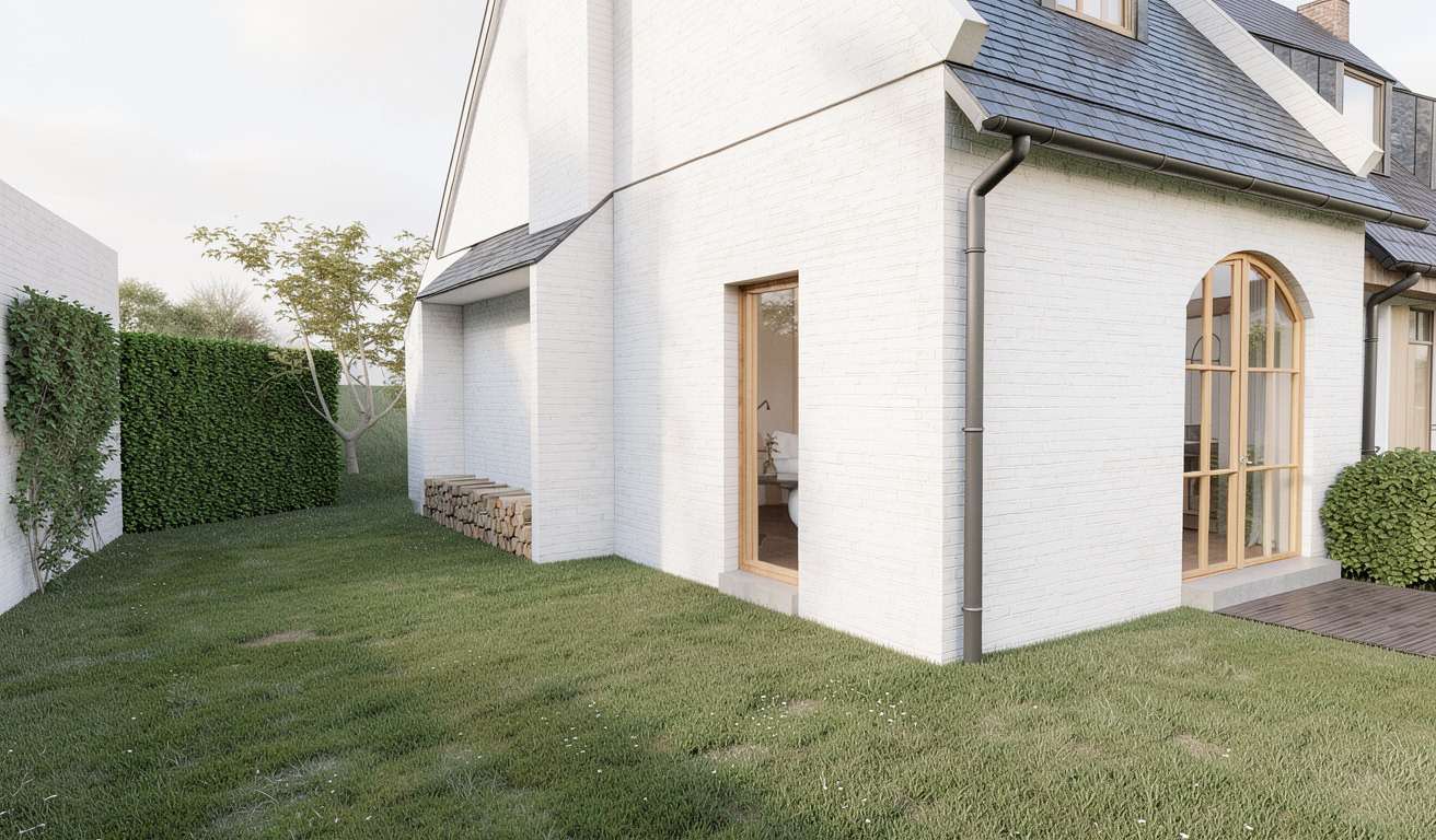 this is a housing estate add trees in background to give it context have indoor warm lighting