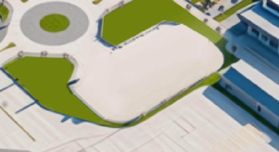 a modern bus terminal with a roof that includes glass elements the bus parking area is angled at 45 degrees vehicles can enter the site from the main road and circulate around the building no landscaping is included realistic style clear lighting maintain the current view angle