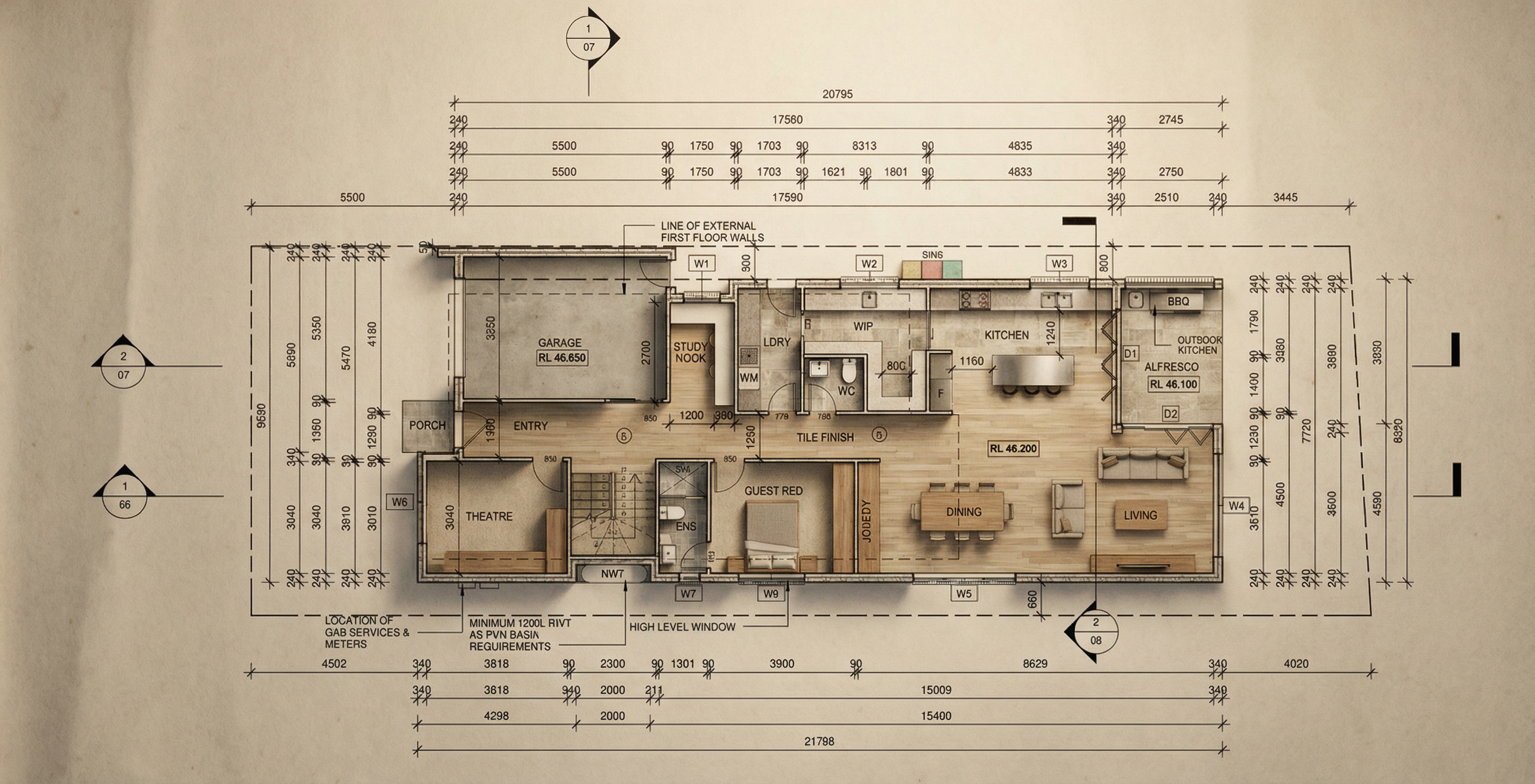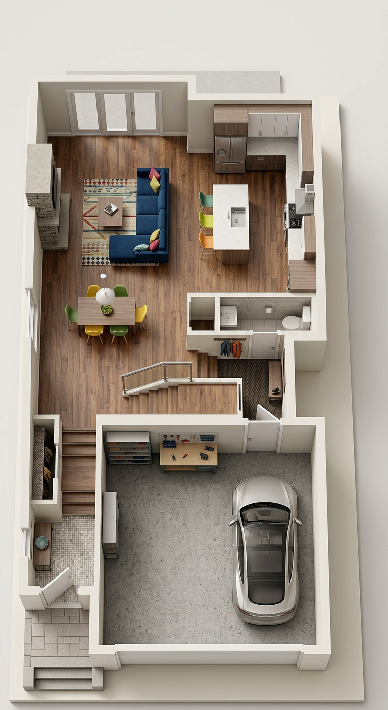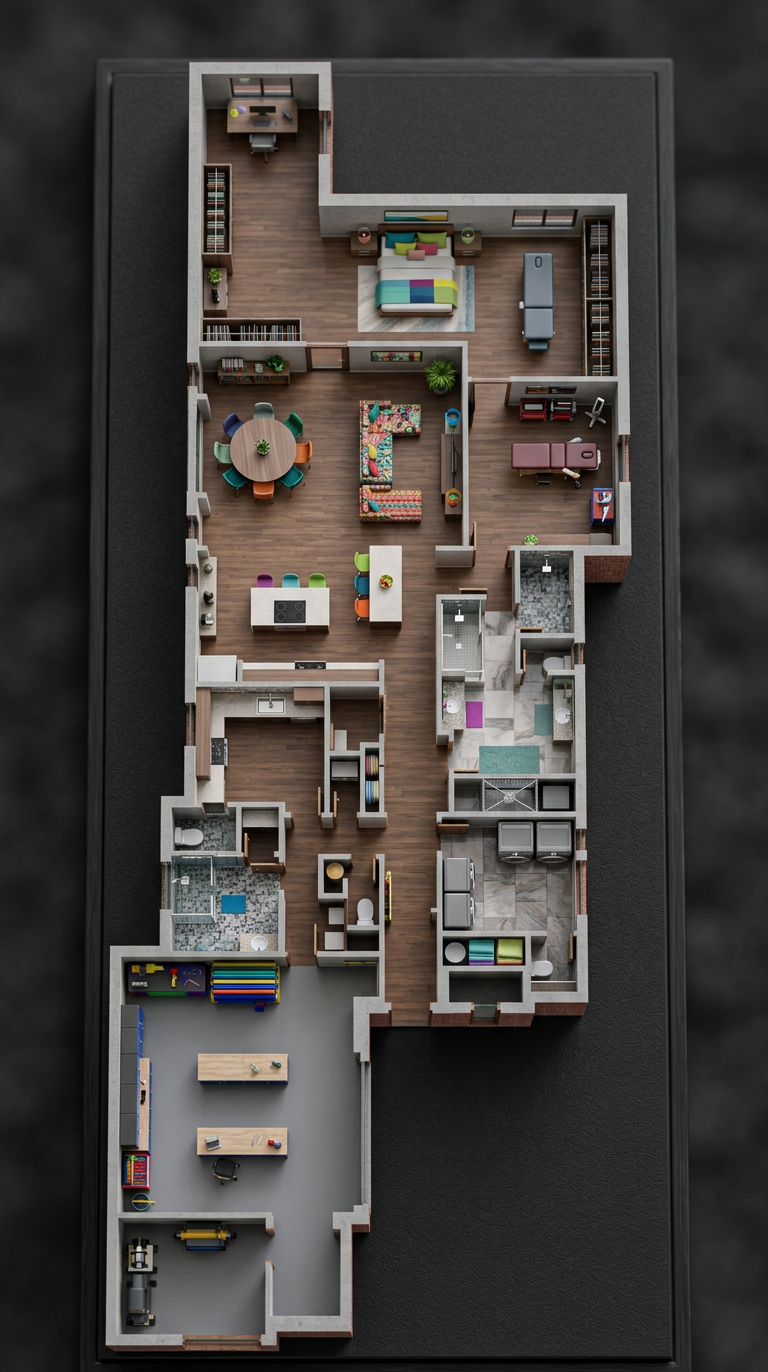 convert this floor plan into a realistic isometric 3d view of a full house show the space from an elevated angle with furniture walls and details visible use the same furniture as shows on the plan do not change the orientation of the floorplan