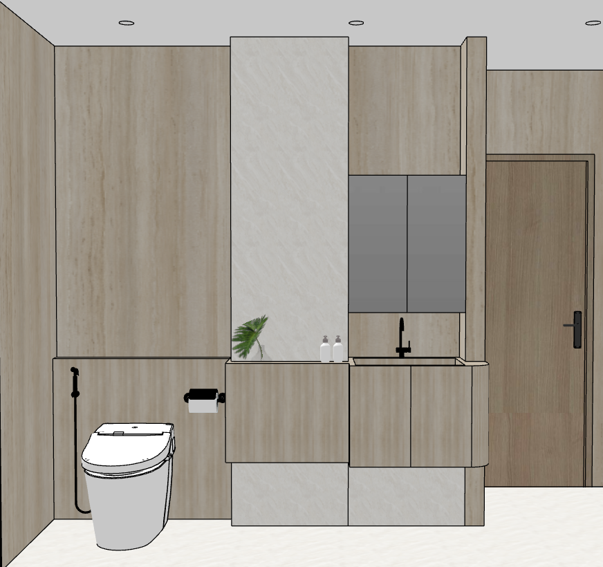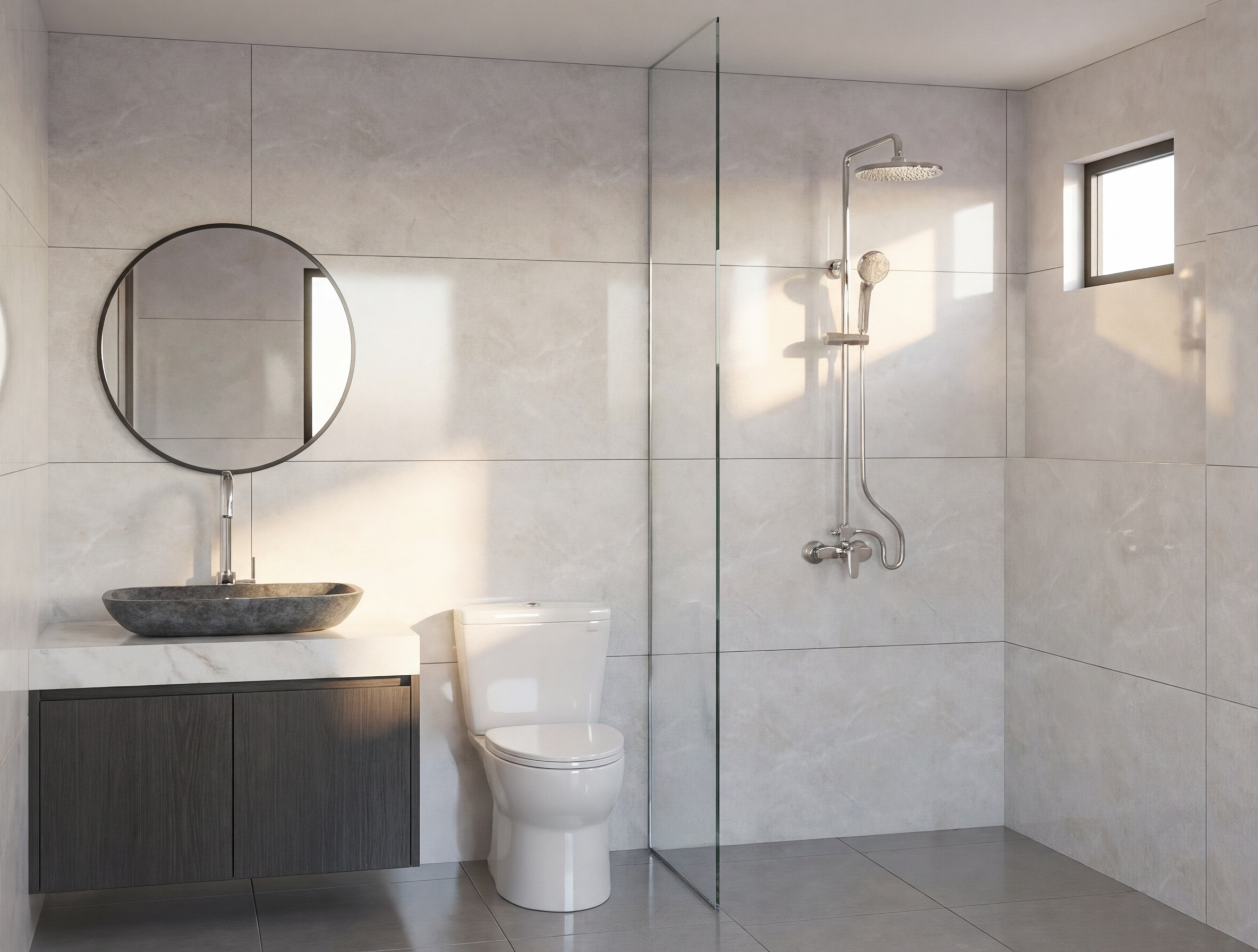 create a minimalistic bathroom with travertine stone on the wall travertine vanity cabinet with mirror cabinet and led lights below it soft biege stone flooring in matte finish white