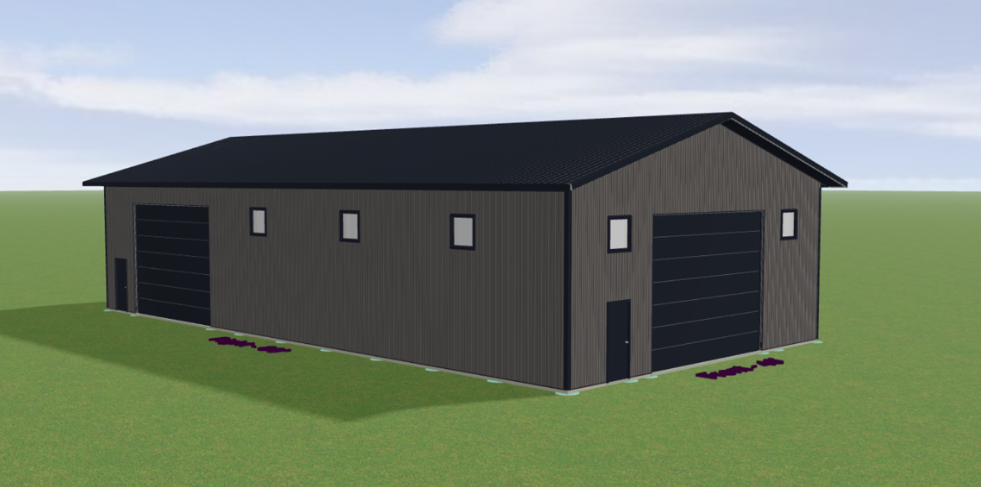 can you make this look more realistic as if taken through a camera add some rural trees in the background and make the yard look nice add a driveway to both overhead doors