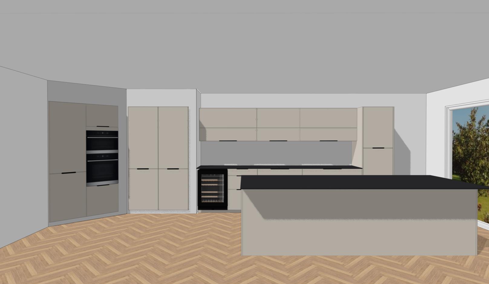 ajoute de l clairage sous les meubles hauts ajoute une table manger rectangulaire moderne en bois sur la gauche de l ilot ajout des tabourets devant l ilot