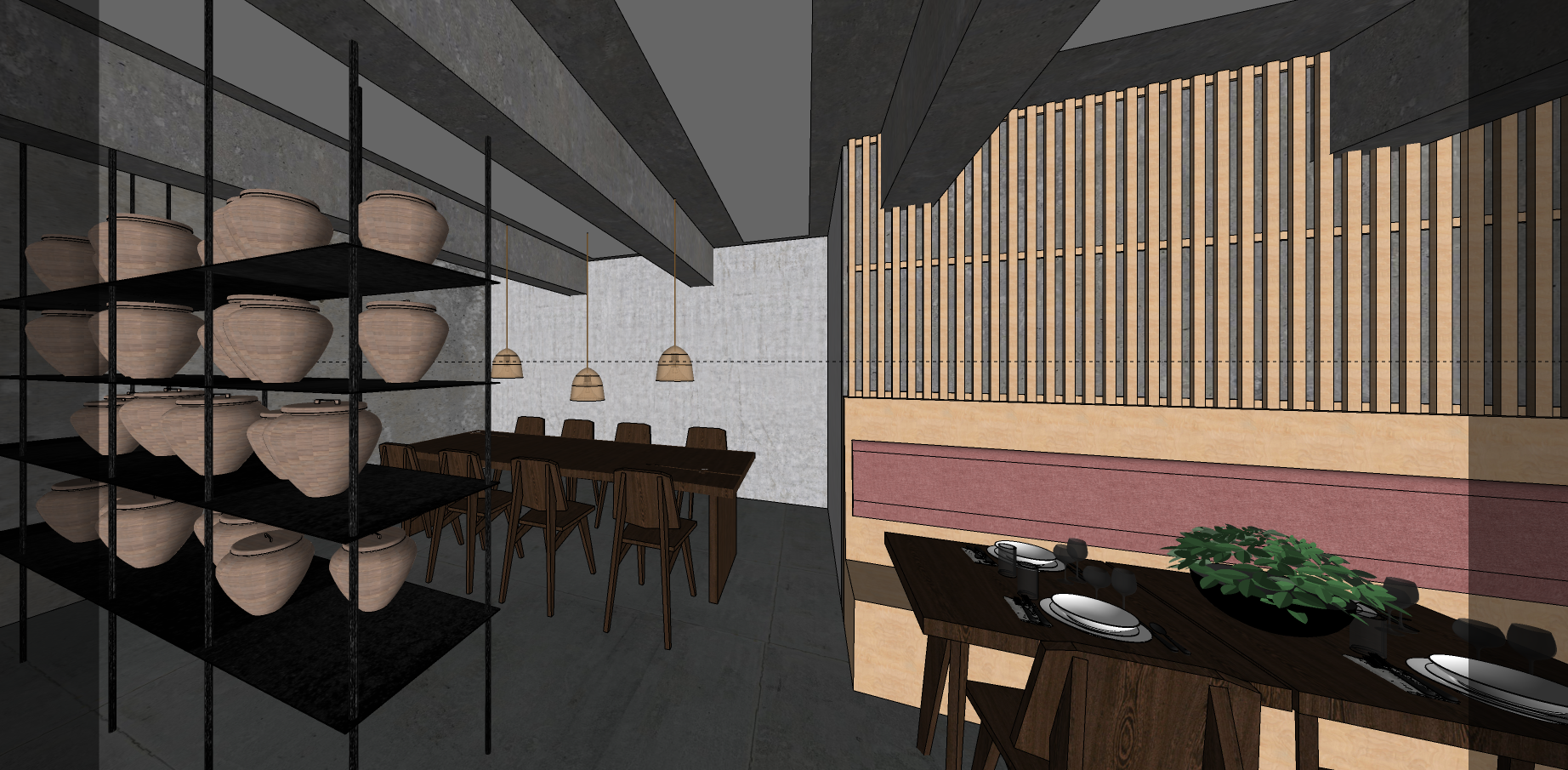 interior shot of a restaurant with wooden slats warm ambient lighting