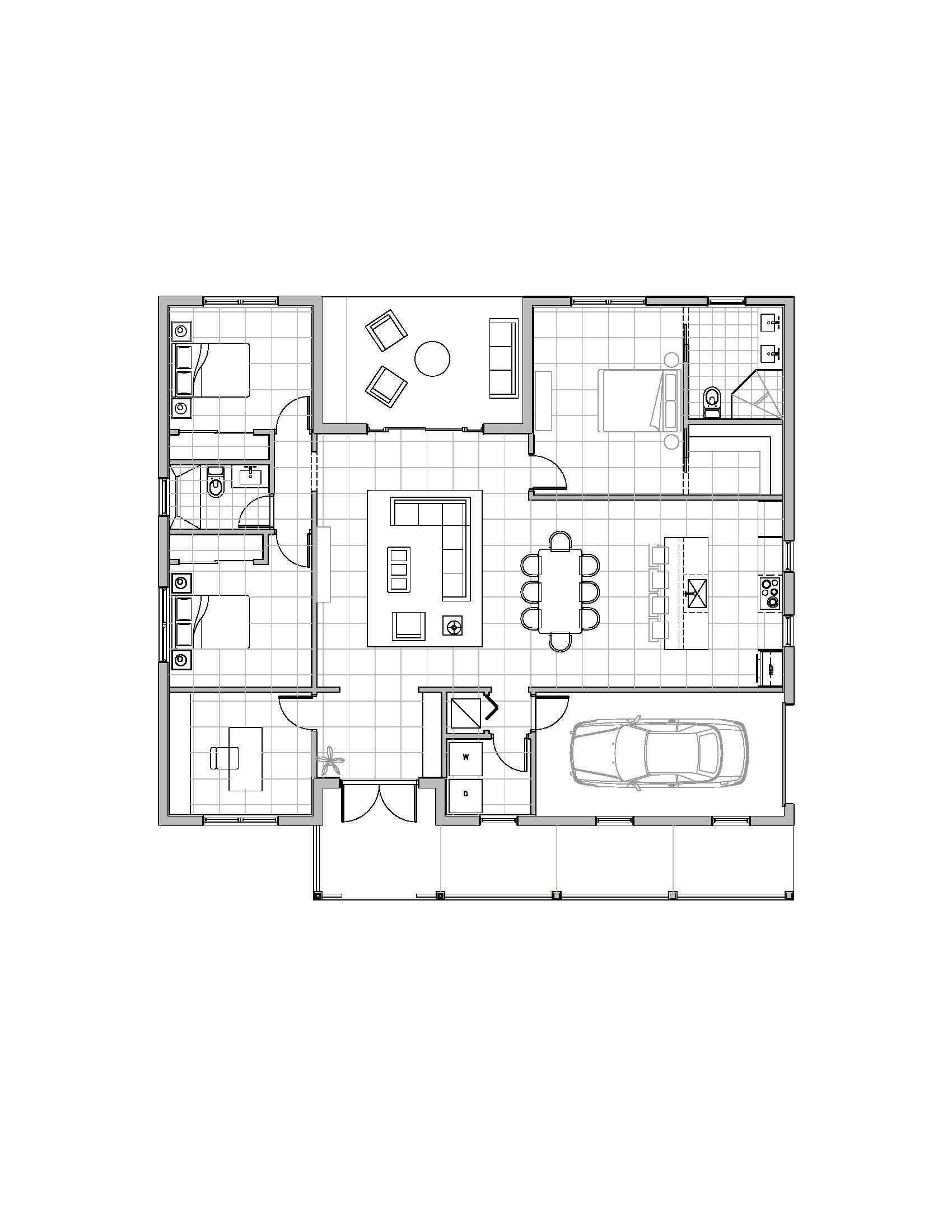 light beige tile floors modern furniture and kitchen small tile at bathroom modern plumbing fixtures 2d image