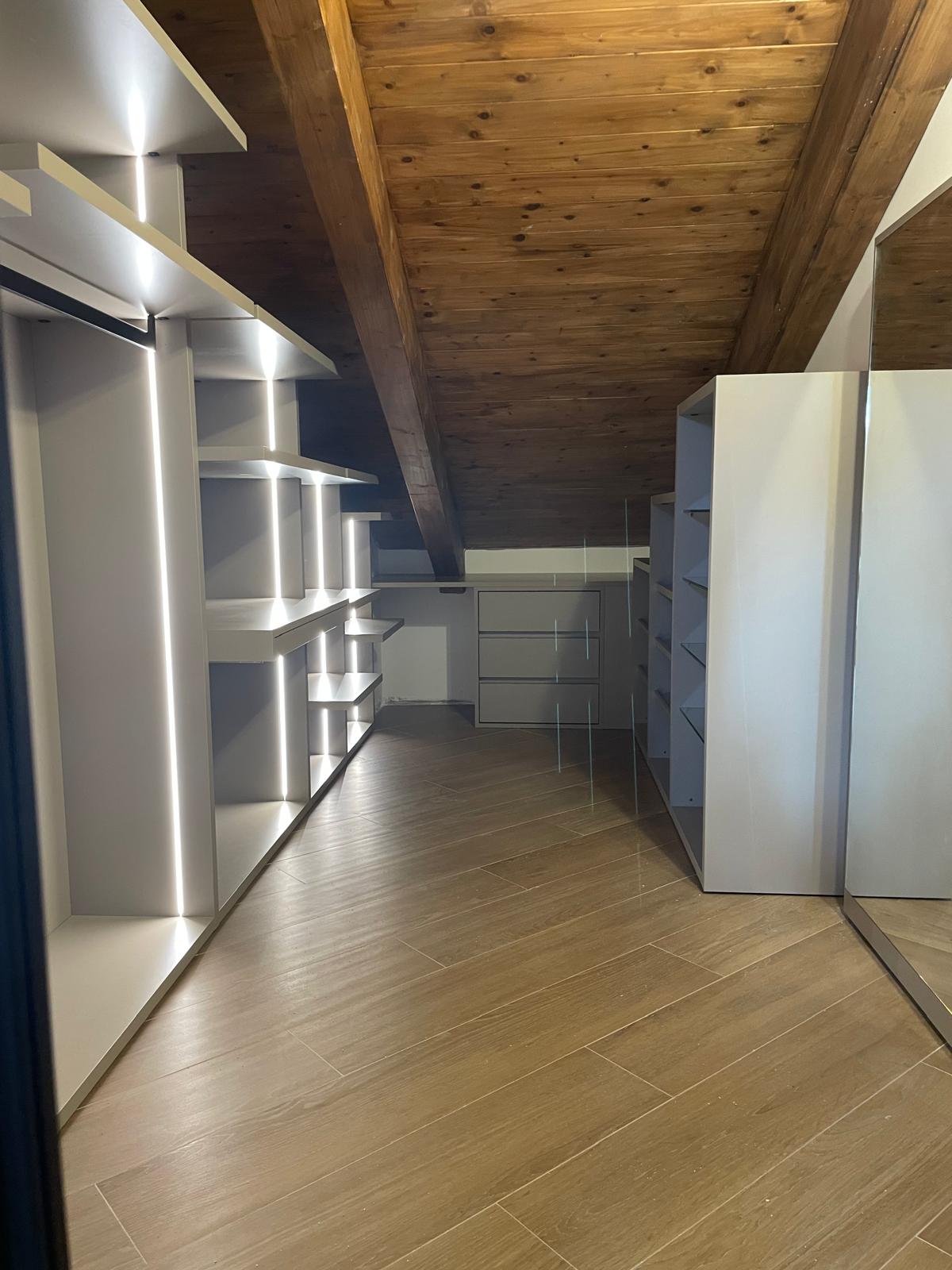 fill this walk in wardrobe with elegant women s clothing while keeping the existing architecture shelves lighting and camera angle unchanged use the clothing layout shown in the reference image folded sweaters and knitwear on the shelves hanging blouses and shirts on the upper hanging rails hanging trousers and skirts on the lower rails shoes neatly placed on the bottom shelves a few elegant storage boxes and accessories the style should feel refined and minimal neutral tones such as white beige cream taupe and light grey add a subtle touch of yellow through a few garments or accessories for example one blouse a folded sweater or a scarf to create a soft color accent clothes should look realistic elegant and slightly luxurious silk blouses tailored trousers soft knitwear keep the wardrobe tidy and balanced with a showroom like styling photorealistic soft lighting natural fabric textures important do not modify the wardrobe structure shelves led lighting or the wooden ceiling