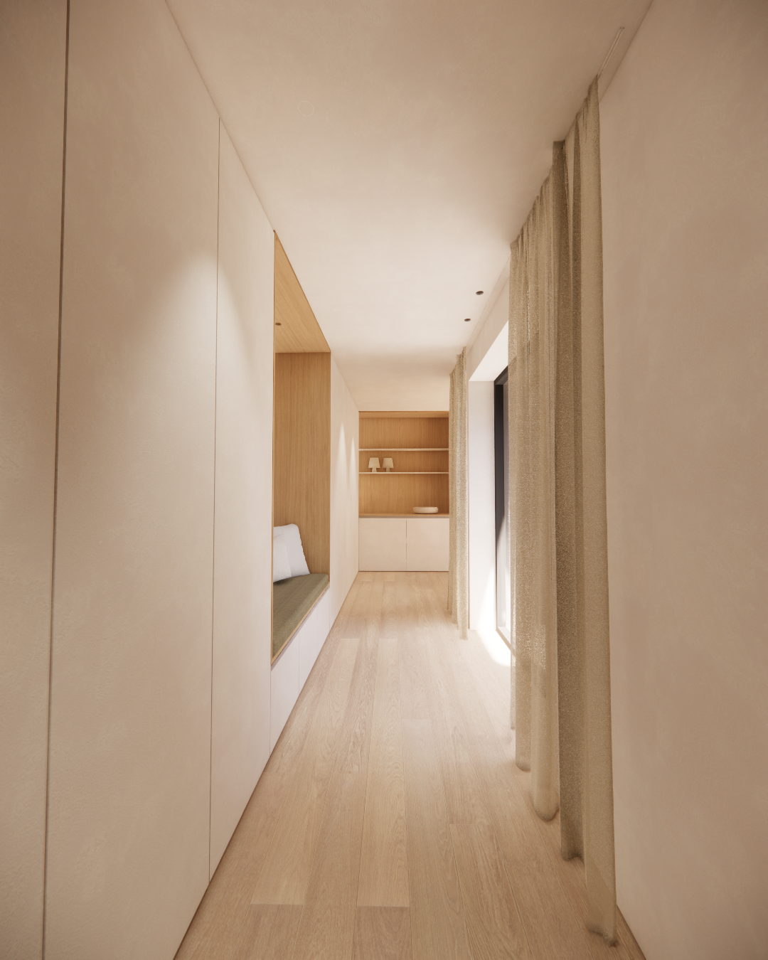 make the following image more realistic add light to the ceiling spotlights make the wood in the seating niche and in the hallway less yellow make the seat cushion and the separate throw pillows look more realistic ensure a beautiful natural light fall into the space and make sure the overall image does not have a yellow tint only ure elements from the original image do not add any additional handles or ligtspots