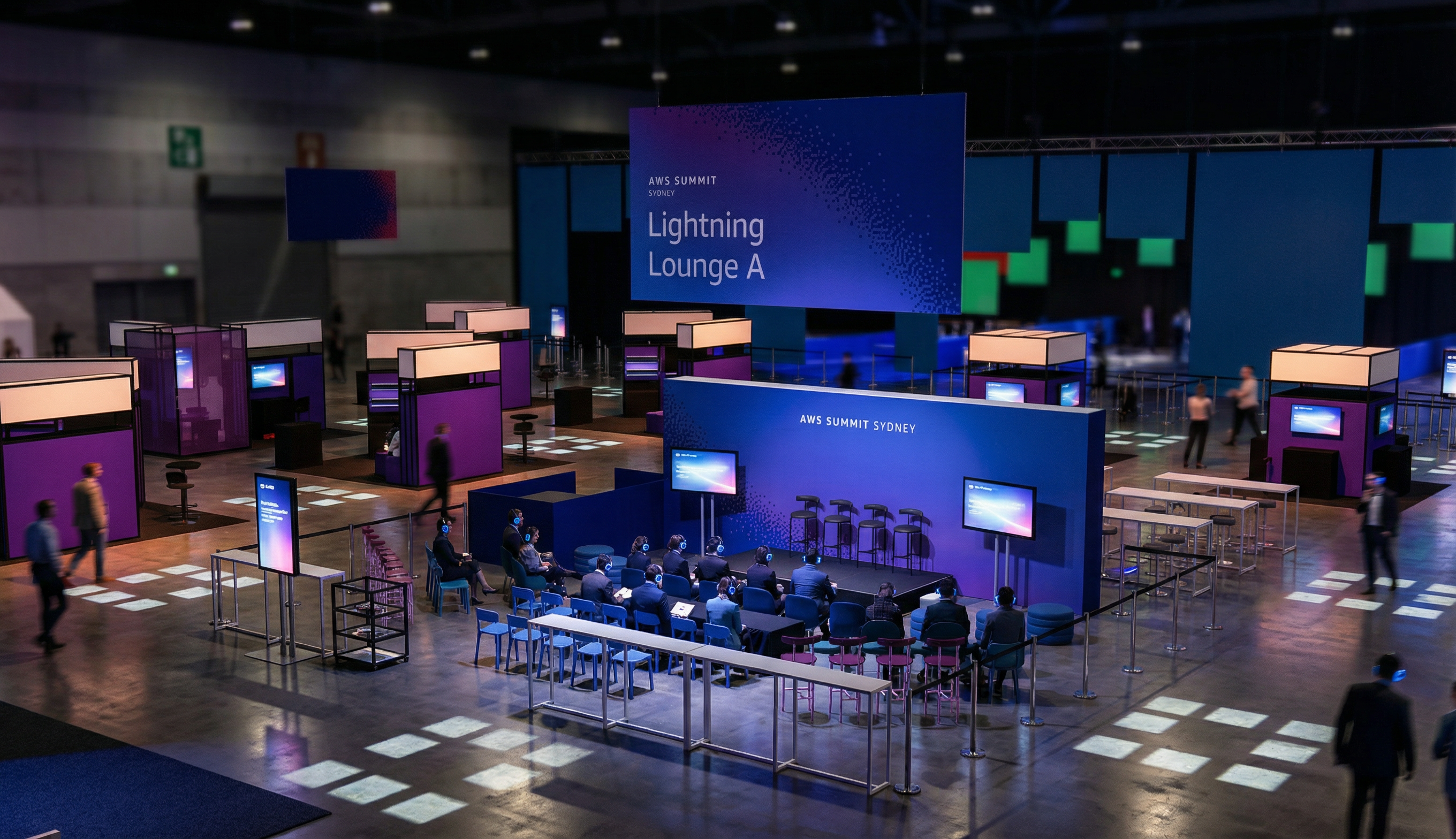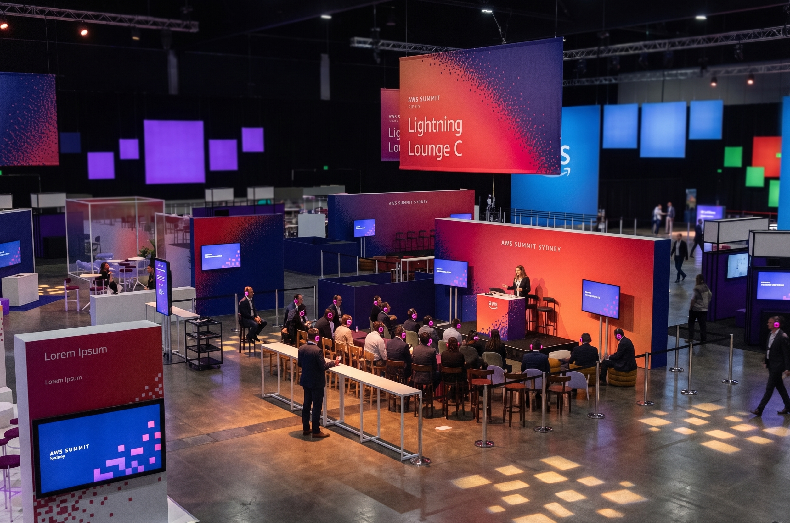 realistic dark expo environment workshop space slightly vibrant atmosphere polished concrete floor subtle light focusing on main space from truss have business people with pink glowing headphones sitting at the seats in front of the stage wall presenter on stage speaking slight blur of background have people walking past blurred light square gobo lights on floor scattered