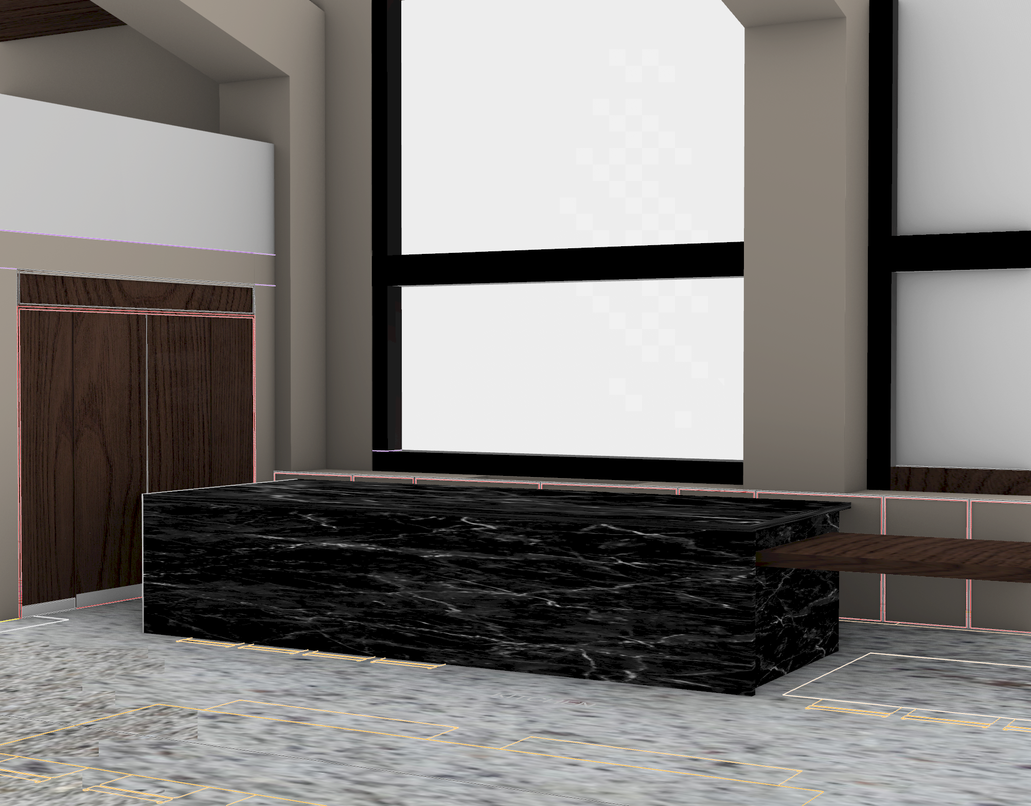 ultra realistic architectural render of a modern luxury kitchen with a monolithic black marble island as the focal point soft golden hour sunlight streaming through large black framed floor to ceiling windows casting long warm shadows across the stone floor highly detailed materials polished black marble with subtle white veining and realistic reflectivity rich dark walnut wood cabinetry with natural grain variation matte taupe paneling warm off white plaster walls with soft texture add realistic imperfections micro scratches and natural variation cinematic lighting with global illumination soft ambient bounce light warm color grading slight atmospheric haze photorealistic 8k shallow depth of field focus on island high end editorial interior photography style 1 fix your windows biggest problem rn right now they re blown out flat add soft exterior autumn forest visible through windows balanced exposure visible outdoor detail no overexposed windows 2 fix your marble second biggest issue it looks too flat cg right now add physically accurate reflections subtle gloss variation ray traced reflections heavy realistic marble depth and contrast in veining 3 push the mood this is what your references have add warm cozy atmosphere soft shadows natural light falloff slightly desaturated tones earthy palette 4 camera polish this matters more than you think add low eye level perspective 35mm lens architectural photography framing no flat lighting no overexposed windows no plastic textures no overly glossy surfaces no harsh contrast no low detail textures no artificial look no noise artifacts inspired by warm luxury cabin interiors with floor to ceiling windows overlooking an autumn forest soft golden natural light cozy and inviting atmosphere everything is matte make marble to scale and railing above cabinetry is glass