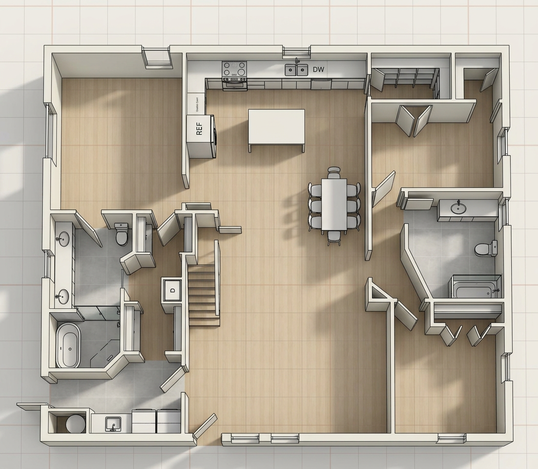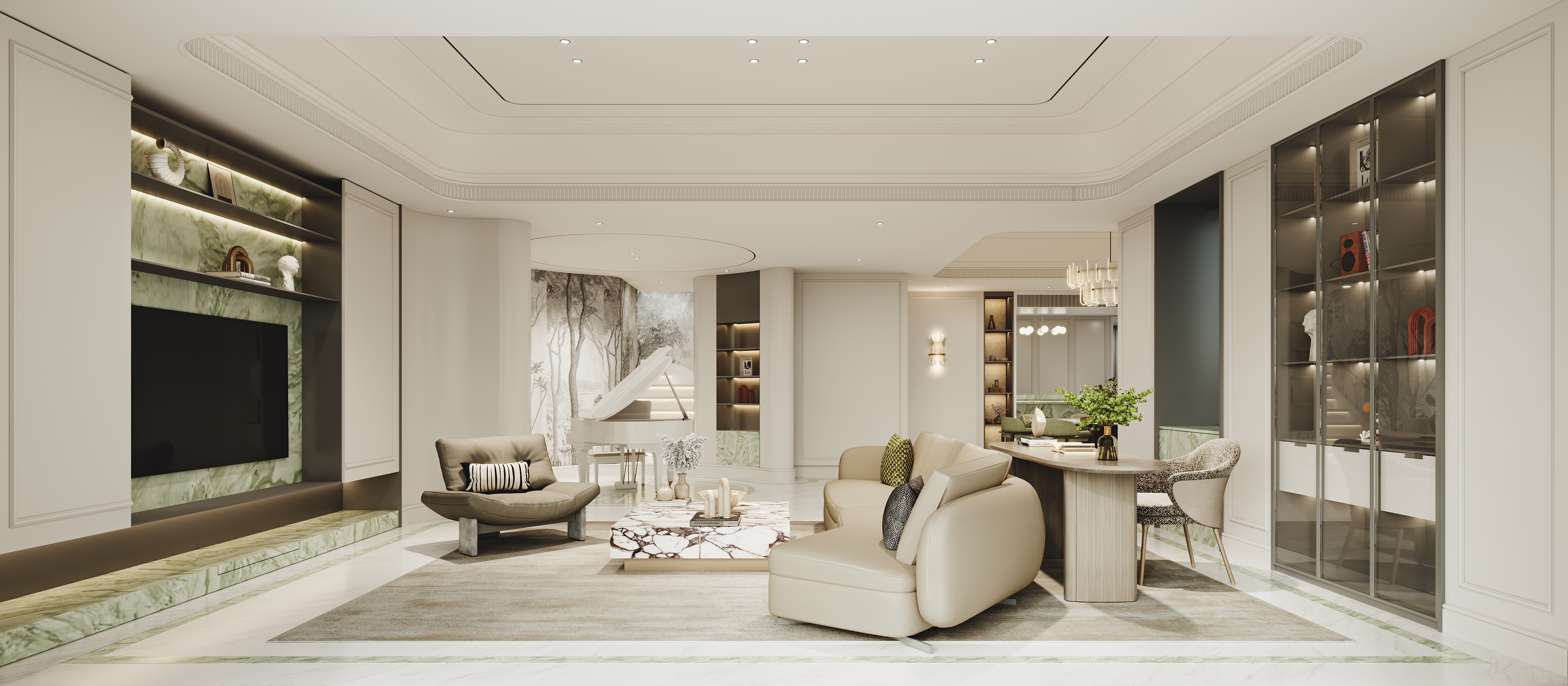 photorealistic render of a living room in modern neoclassical style featuring soft green luxury marble tv ledge and cream coloured wall panels furniture features modem italian selection mainly in neutral tones beyond the living room is a white baby grand piano is an alcove walls around the piano is adorned by handprinted monochromatic trompe l oeil wall covering the whole ambiance is bright and airy while maintaining wam and cozy atmosphere maintain materials as is