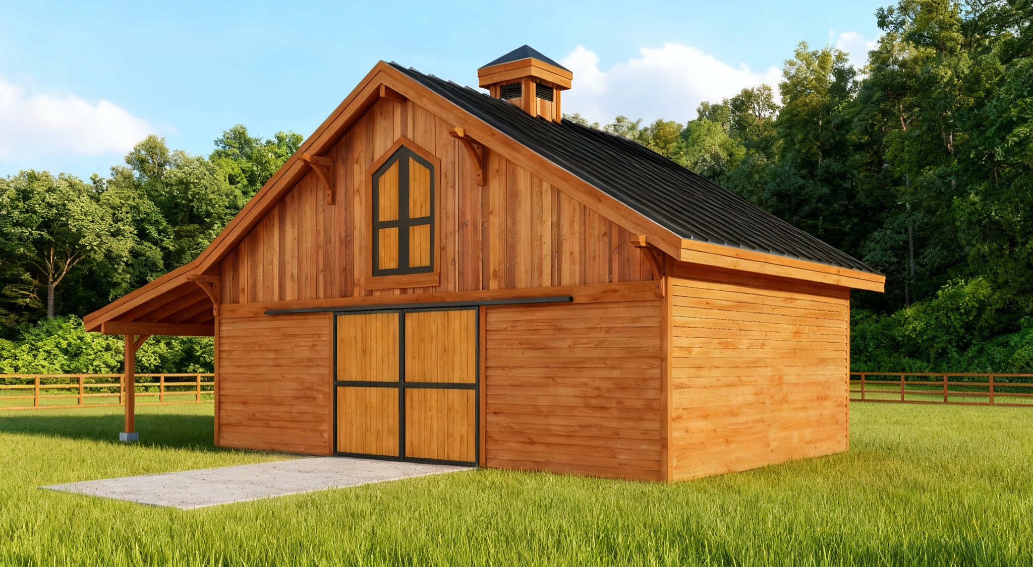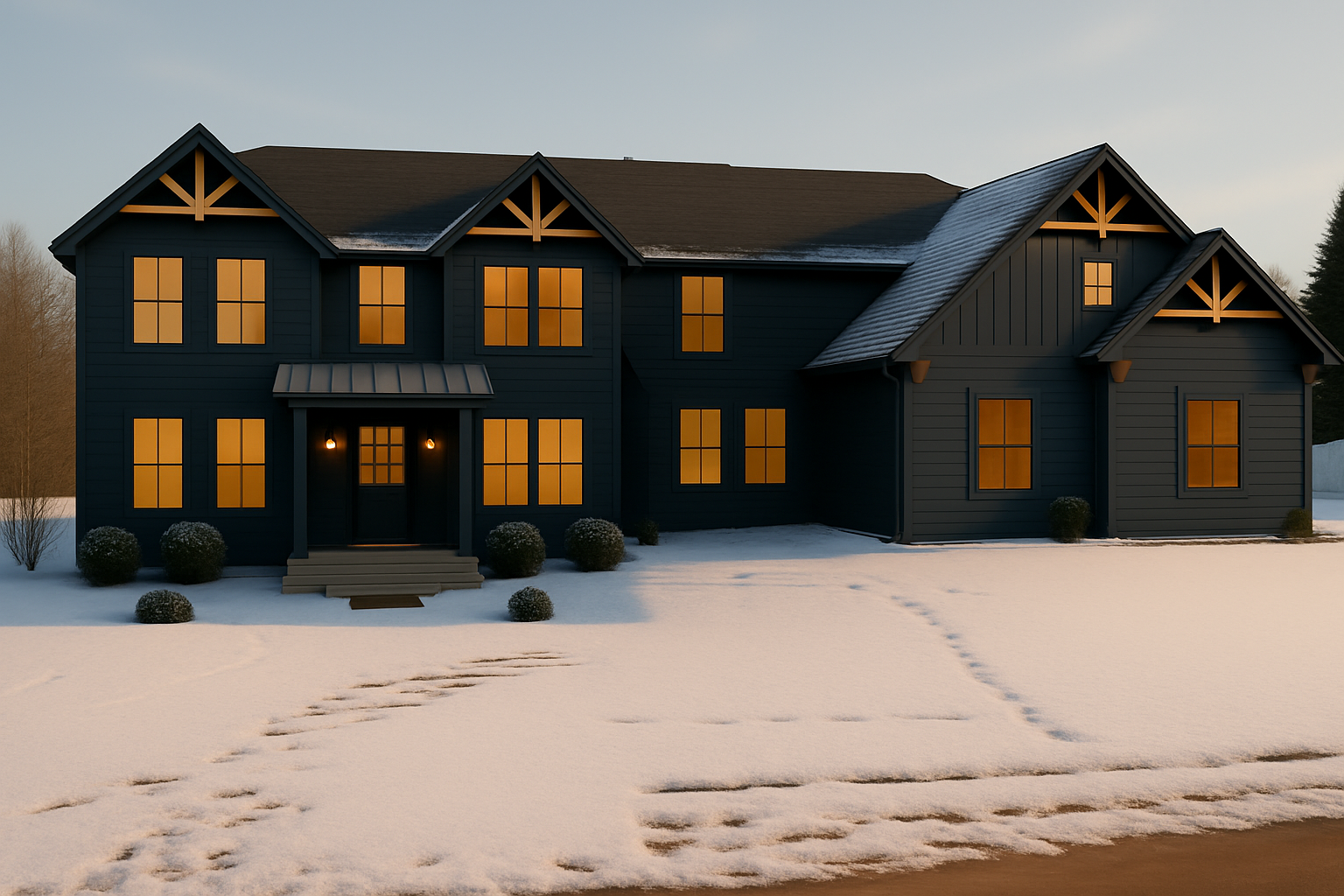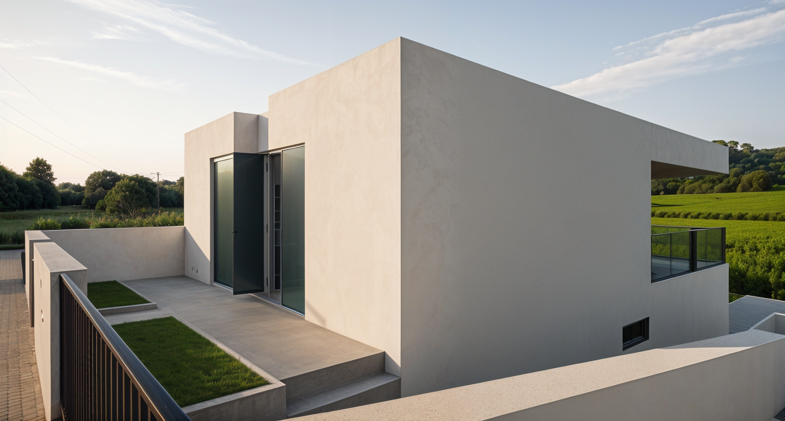 add driveway to front of garage use dusk setting and lighting show wild grass around garage