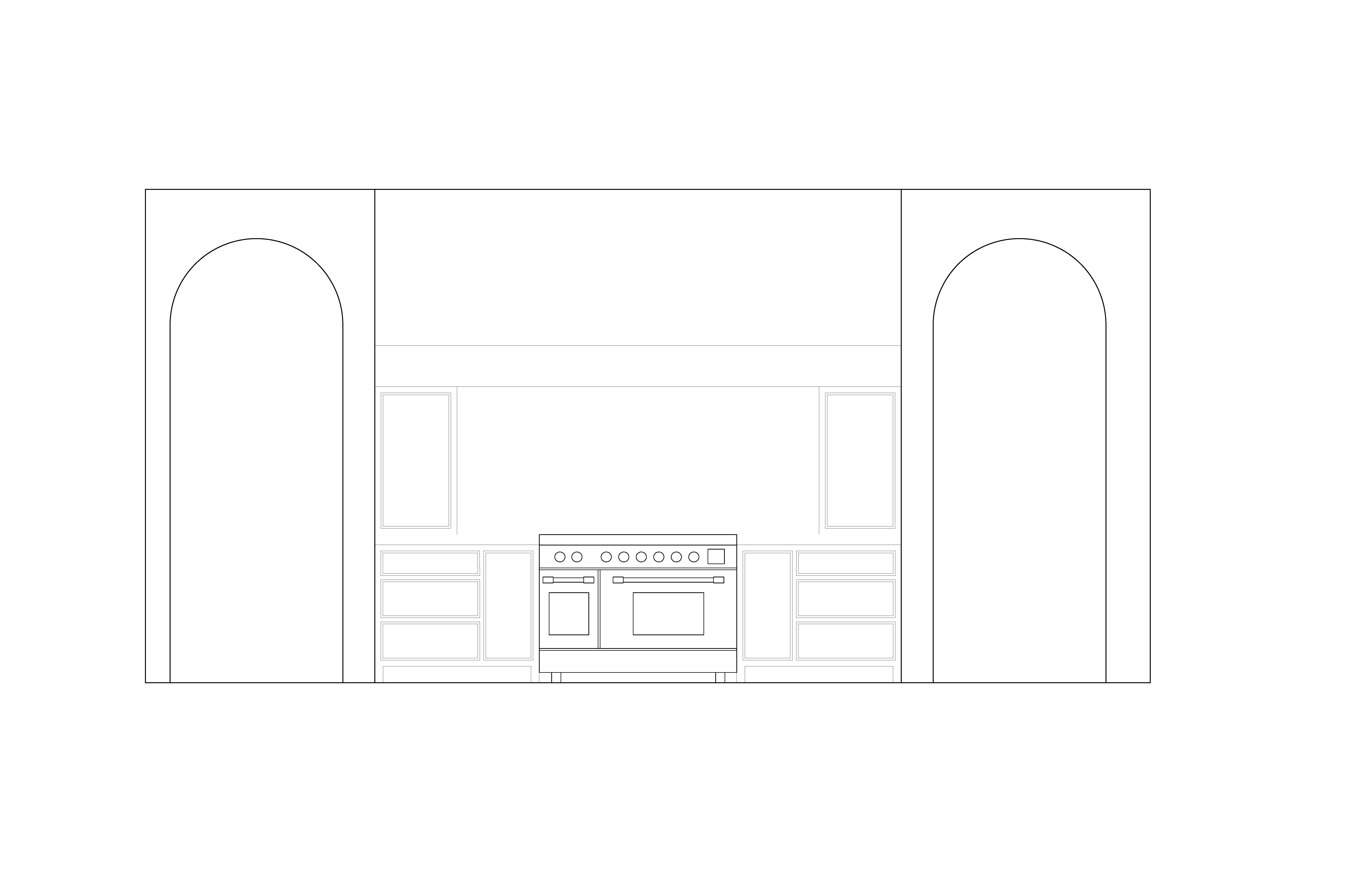 convert the provided 2d elevation line drawing into a highly realistic 3d architectural interior render preserving the exact proportions spacing symmetry cabinet layout arch dimensions and appliance placement precisely as drawn the composition must remain centered and balanced with two large symmetrical arched openings on the left and right and the cooking zone centered between them the range hood must span fully wall to wall between the two vertical wall breaks forming a continuous monolithic mass exactly as indicated in the drawing do not reinterpret redesign or alter any geometry the wall to wall range hood should be finished in hand troweled venetian plaster with a soft mineral texture and subtle tonal movement the surface should be matte warm off white or light cream in tone with gentle artisanal variation that feels refined and natural rather than rustic or rough the hood should read as sculptural and substantial with crisp but slightly softened edges and no visible seams or panel joints it must feel integrated and architectural not applied or decorative all remaining wall surfaces outside of the hood mass should be smooth painted drywall in a clean warm white matte or soft eggshell finish with no visible texture stone tile or additional wall treatments the design should feel minimal calm and elevated cabinetry should be custom inset or slim frame panel construction in light natural white oak with a soft matte finish and subtle visible grain the craftsmanship should appear precise with tight reveals and clean lines hardware should be understated such as small aged brass or brushed brass knobs or pulls classic and minimal in form the countertop should be a light honed limestone or soft white marble look with very subtle veining and a matte finish featuring a simple eased edge profile the range should be professional style stainless steel with a brushed finish and refined detailing high end but not futuristic lighting should be soft natural daylight diffused and indirect creating gentle shadows and a warm neutral white balance avoid dramatic spotlighting or strong sun beams the mood should feel quiet refined and luxurious use a straight on elevation camera view aligned with the drawing approximately 50 70mm focal length equivalent with perfectly straight vertical lines and no wide angle distortion the render should be ultra photorealistic with physically based materials realistic plaster micro texture subtle wood grain detail soft shadow contact and no cgi plastic appearance do not change proportions do not alter arch shapes do not add cabinetry or architectural elements do not introduce tile backsplashes beams clutter extra windows glossy finishes heavy gray tones or stylized effects maintain strict geometric fidelity to the drawing while elevating the material realism to high end architectural photography quality