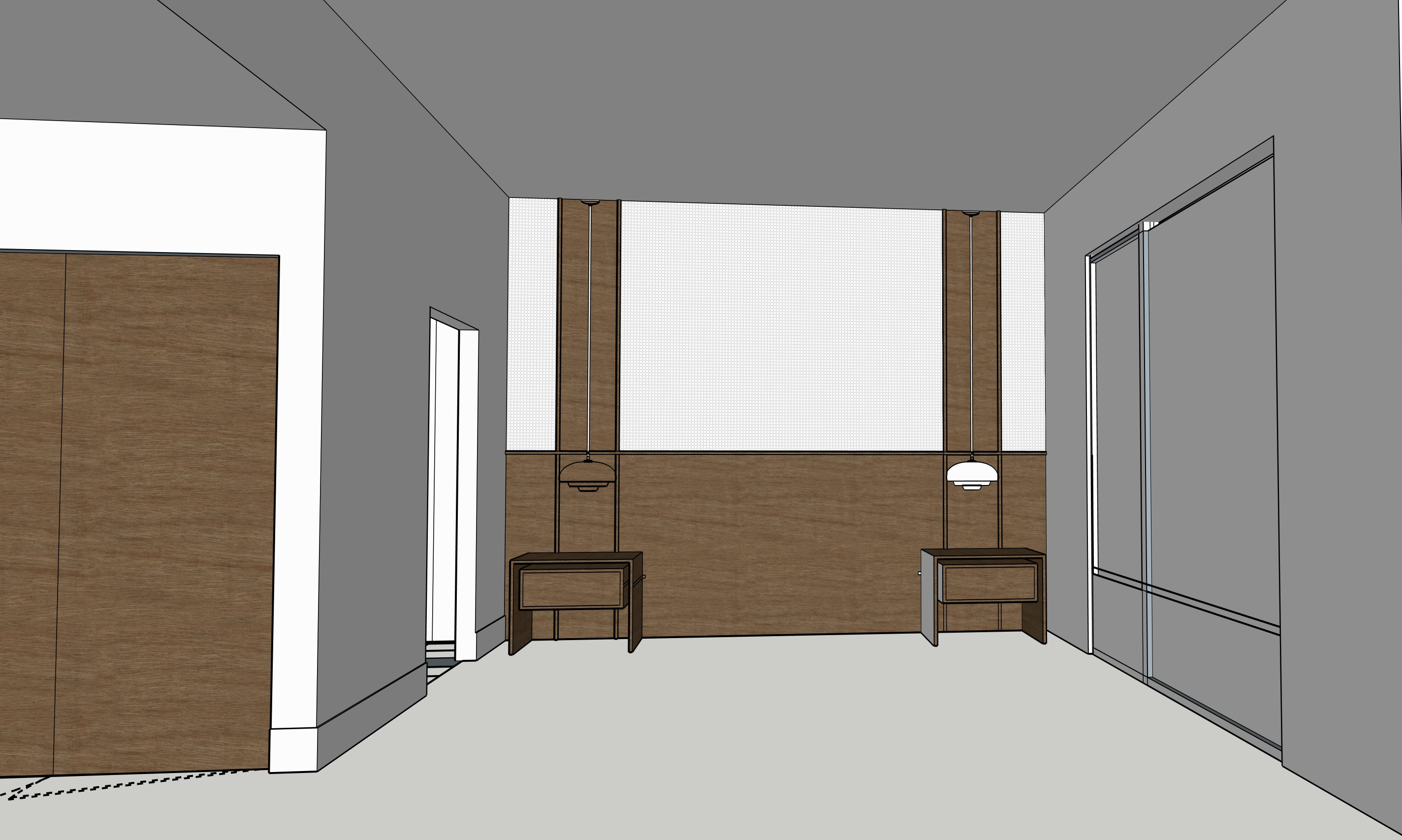 exterior shot render bedroom scene with texture above wood panel areas brass hardware on nighstands panel doors on left and curtains and black frame windows