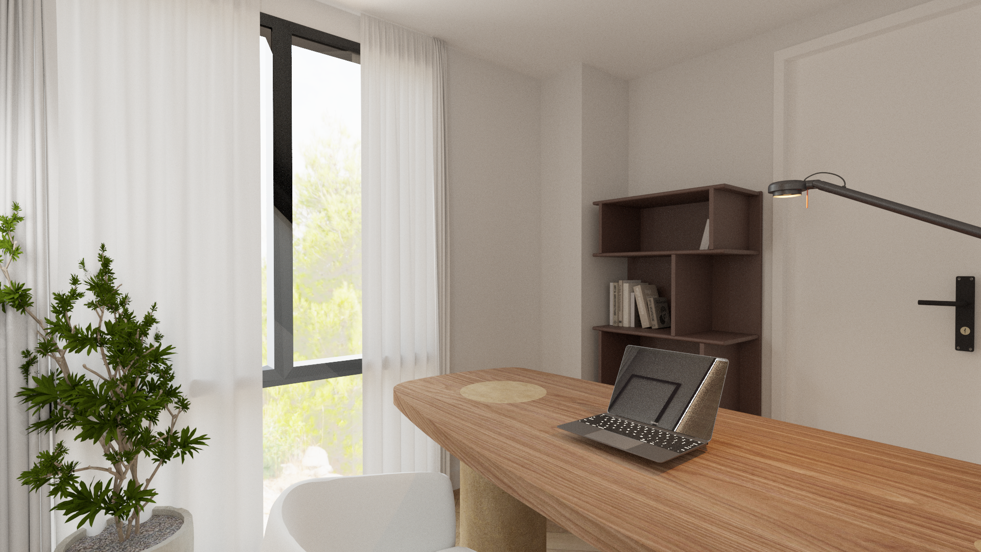 necesito una imagen fotorealista mejora las texturas y a ade algo de decoracion en la libreria en el ordenador elimina los reflejos de la pantalla