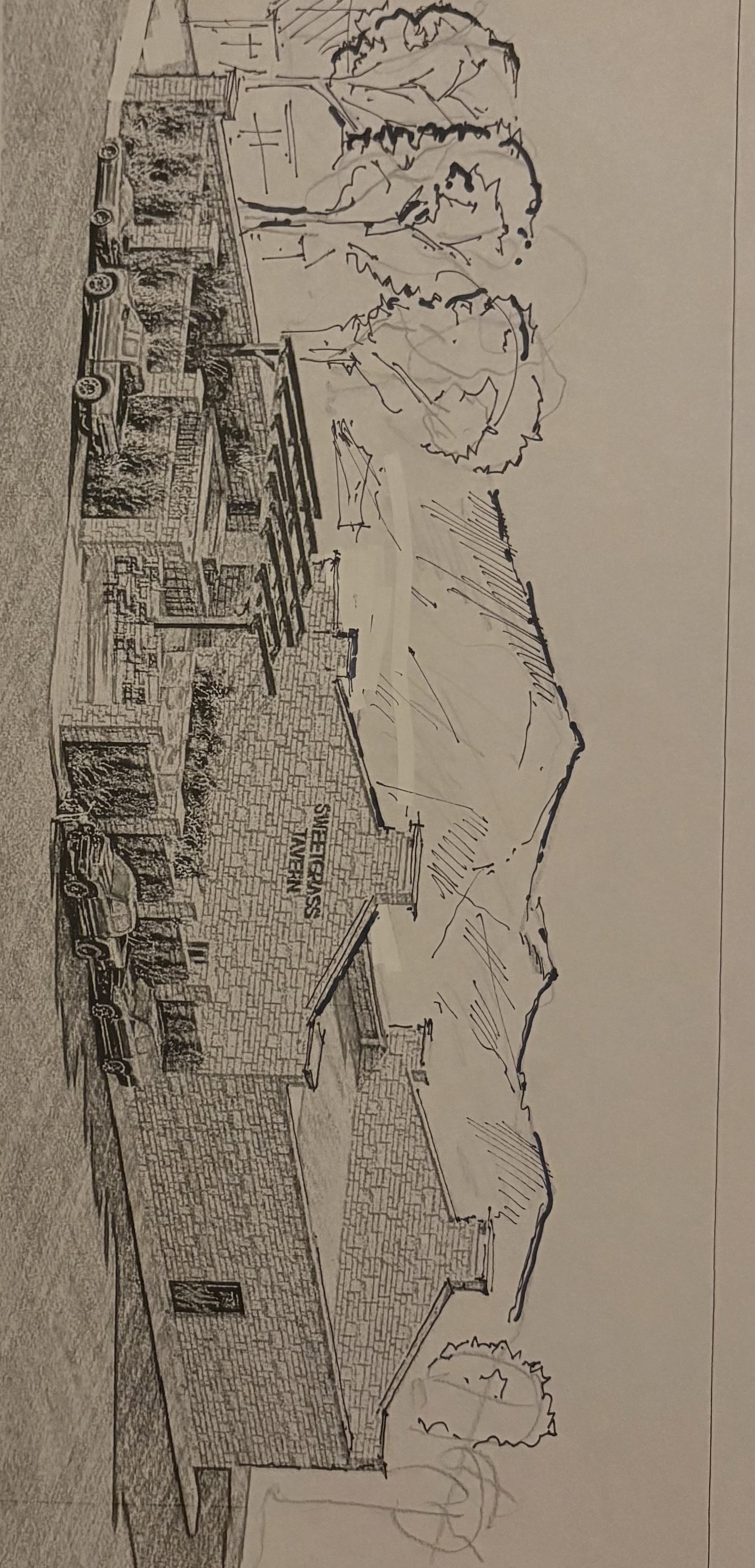 render this building in grey natural stone the timbers will be brown the background trees are deciduous with a distant mountain in the back ground that is faded out