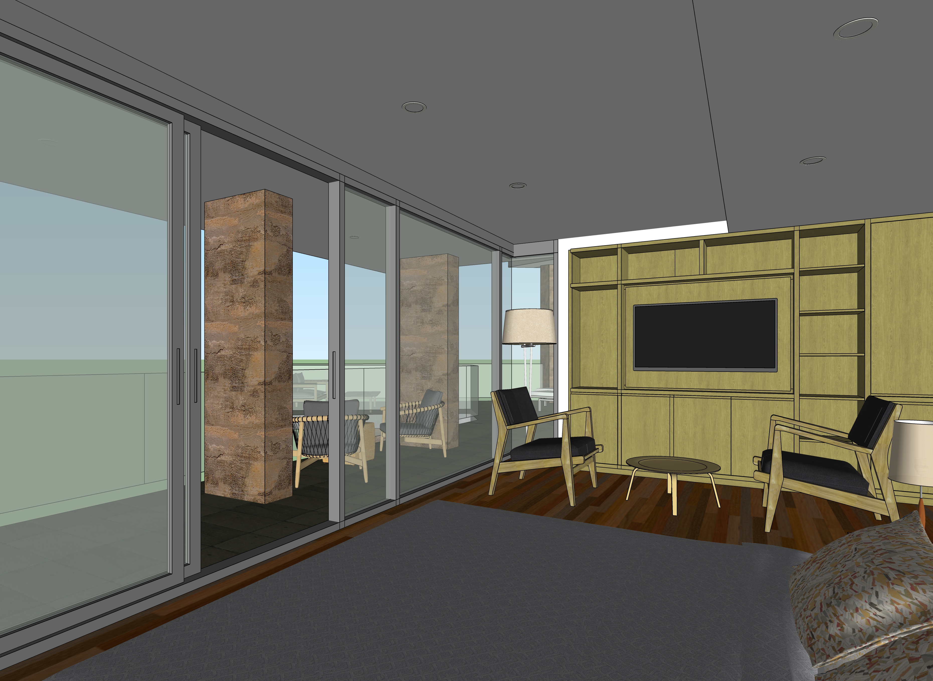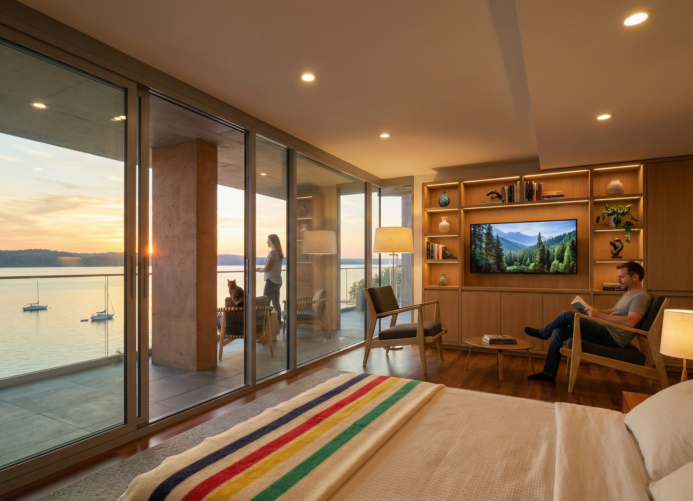 evening view in the summer with a setting sun on the horizon the columns on the balcony are site cast concrete in a natural warm clay color add light to the floor lamps and recessed lights make the view out of the windows of lake pepin from a high elevation with no trees visible below the balcony add books and other accessories to the shelves ad an image on the flat screen of a nature movie add a woman standing on the left side of the balcony looking out towards the view with a cat sitting next to her add a hudson bay blanket draped over the foot of the bed add a man sitting in the chair on the right reading a book add led linear lights to the shelves add two sailboats on the lake