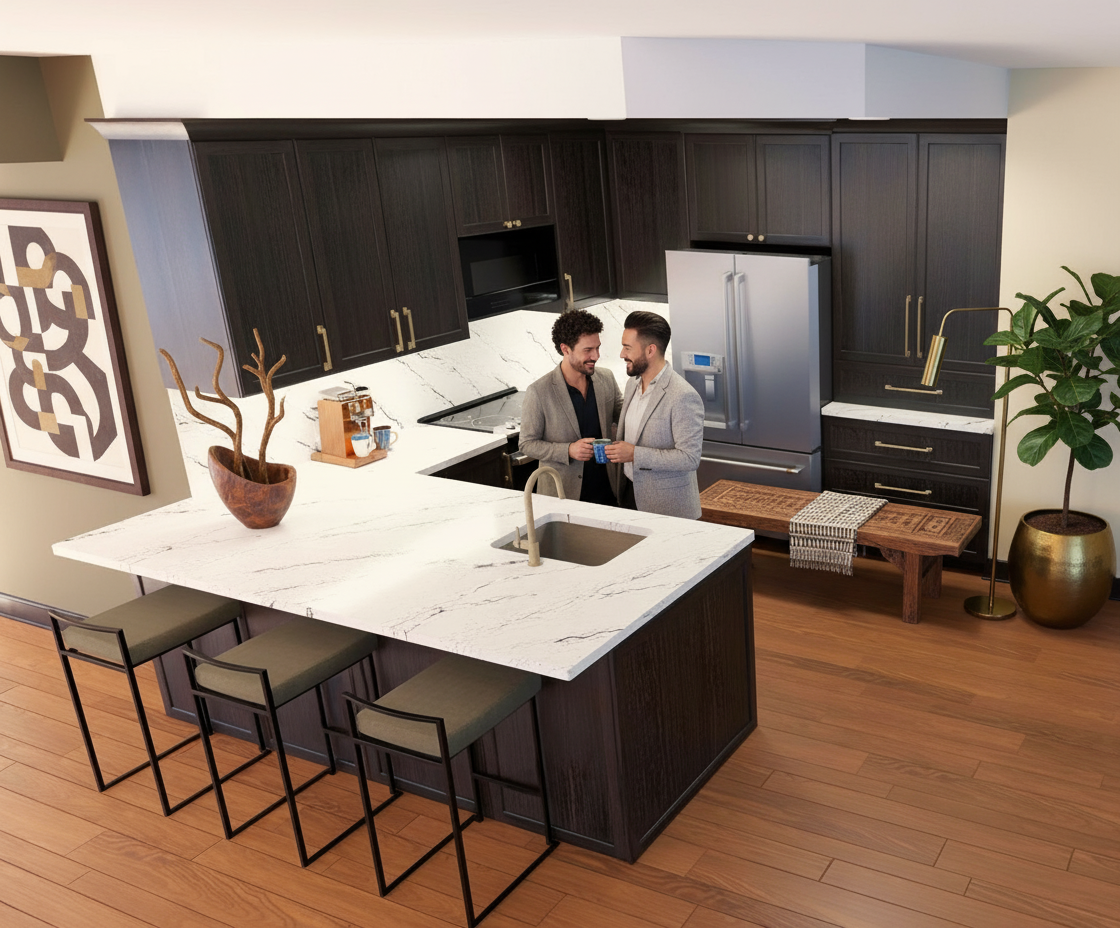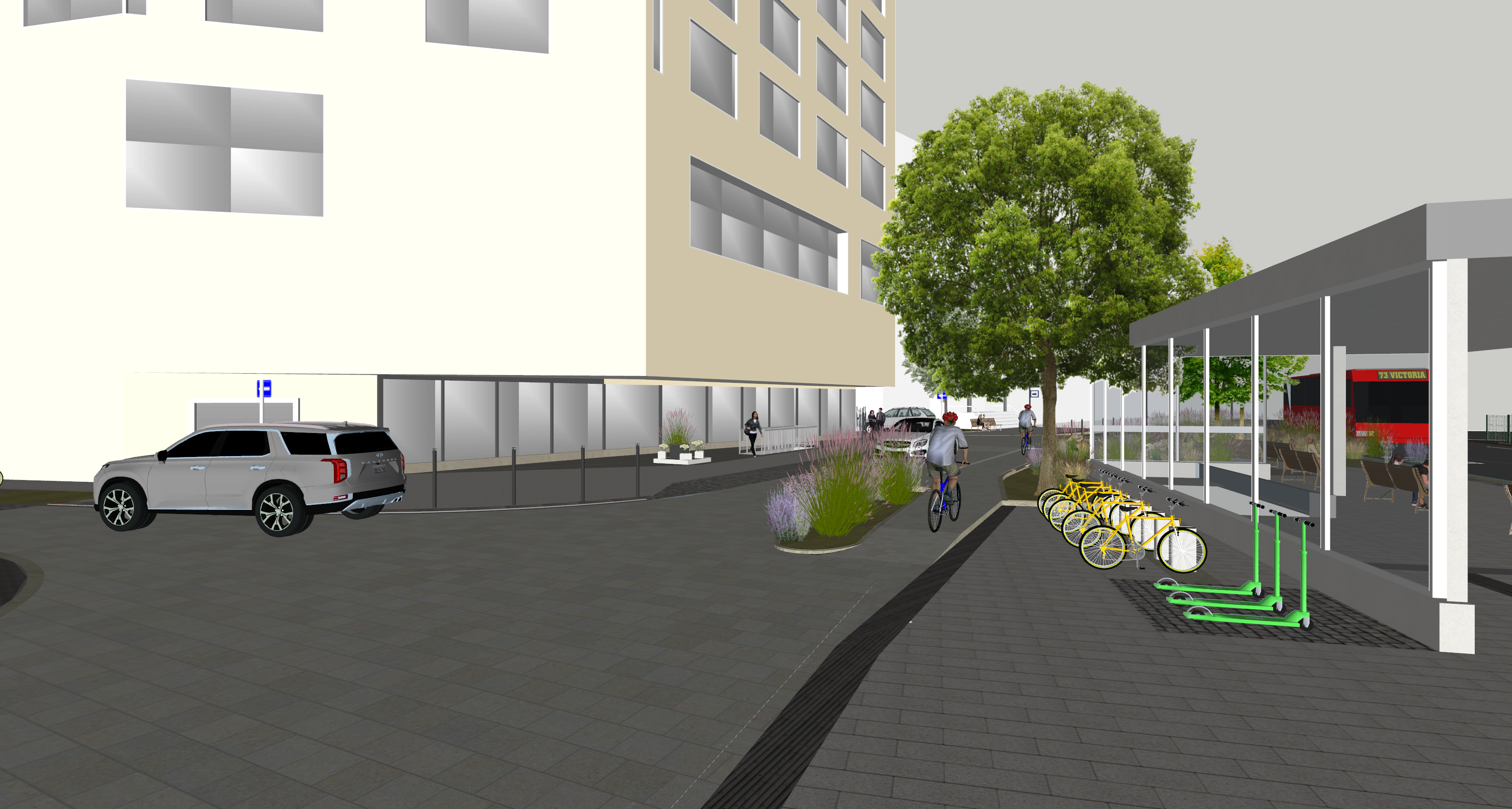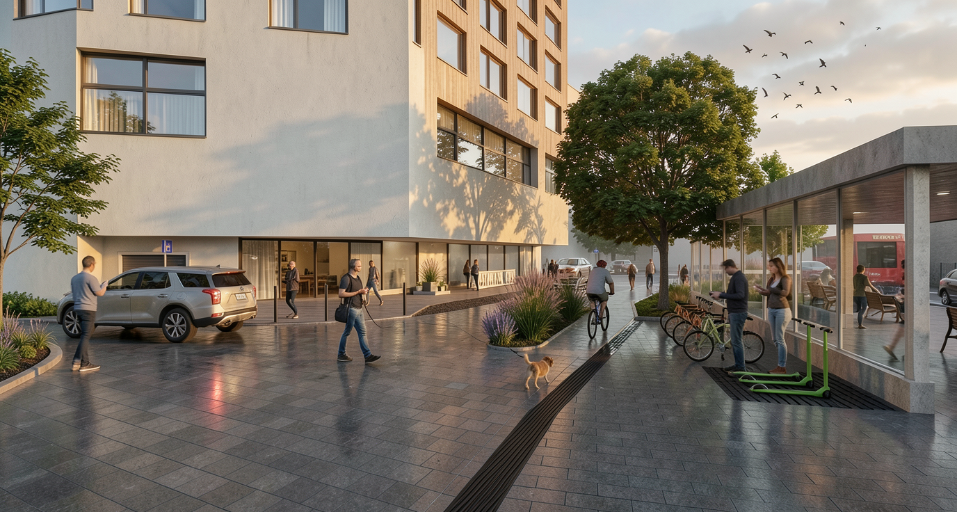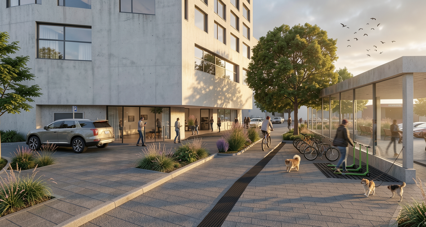 ultra realistic architectural visualization based strictly on the provided raw sketchup view preserve exact geometry proportions camera angle composition and architectural details do not redesign or alter the building enhance only with realism add realistic materials with physically accurate textures natural wood grain brushed concrete glass reflections subtle imperfections micro surface details use high dynamic range lighting with soft global illumination and realistic shadows create a lively atmosphere add naturally positioned people interacting casually walking talking using phones subtle motion blur on some figures for realism include small groups rather than posed characters add a few animals appropriate to the setting e g dog on a leash birds in the sky avoid people and dogs in the middle of the road enhance environment with greenery slight wind in trees varied vegetation tones small urban details parked cars benches subtle signage add depth with atmospheric perspective and realistic sky conditions golden hour soft overcast choose whichever enhances the mood cinematic composition photorealistic rendering 8k detail realistic depth of field natural color grading slightly warm tones architectural photography style shot on full frame camera 35mm lens maintain realism over stylization avoid cartoonish or ai looking artifacts