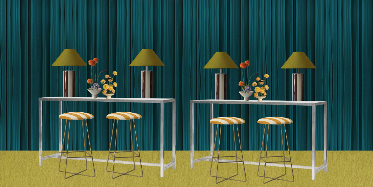 these exact furniture pieces in a dimly lit room with this carpet and this drapery on wall architecture