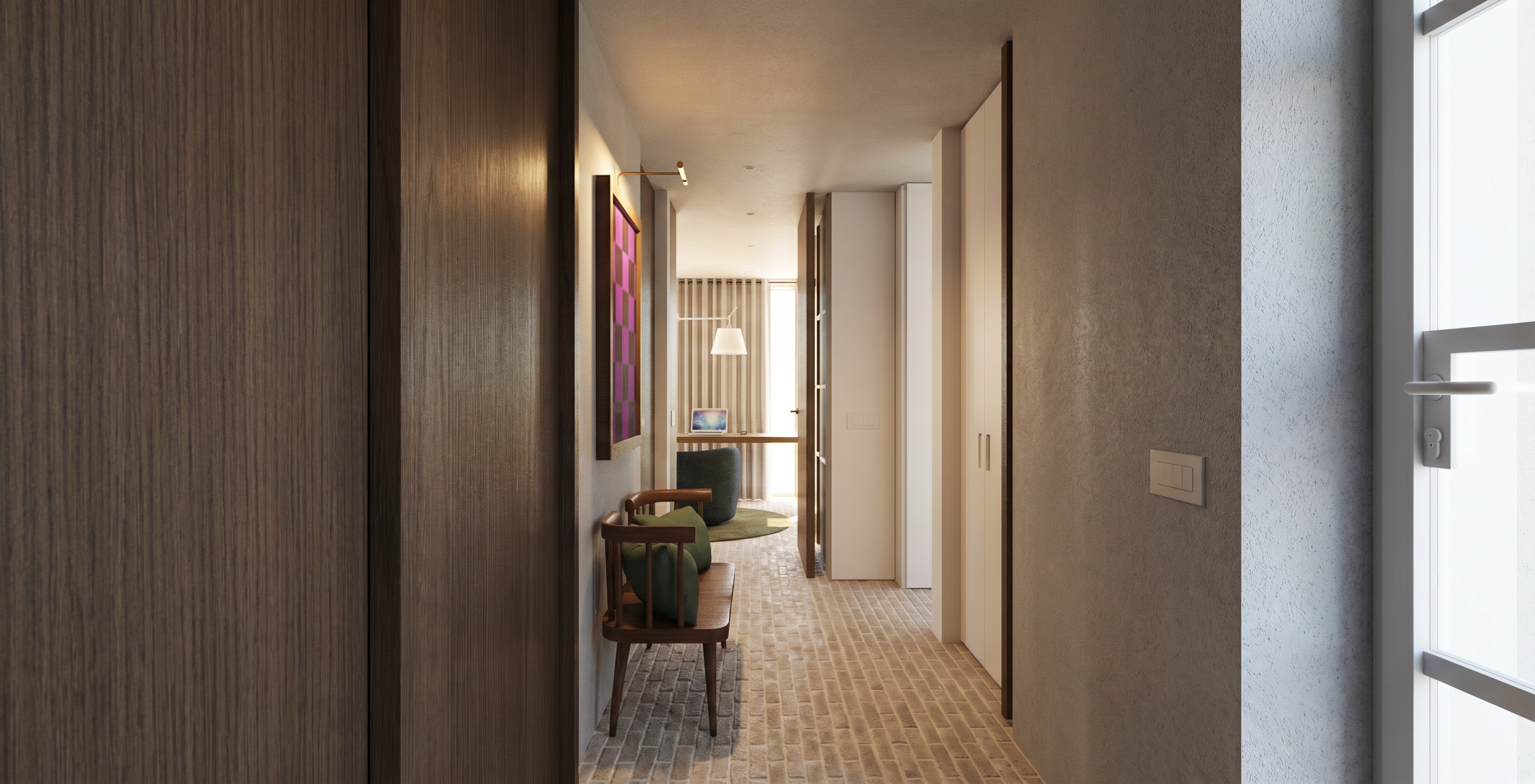 vykresli zimn zahradu v zadn sti vykresli vzrostl exotick rostliny v elegentn ch kv tin ch v pop ed vykresli 2 v t prout n k esla um st n pod l del strany s okny orientovan proti sob bokem k del st n s okny mezi k esly vykresli men elegantn kulat d ev n stole ek v dez nu palisandr na st n vlevo vykresli st obr zku v elegantn m zlat m r mu s motivem modern ho um n paul klee nem v ez obr zku ani hel kamery