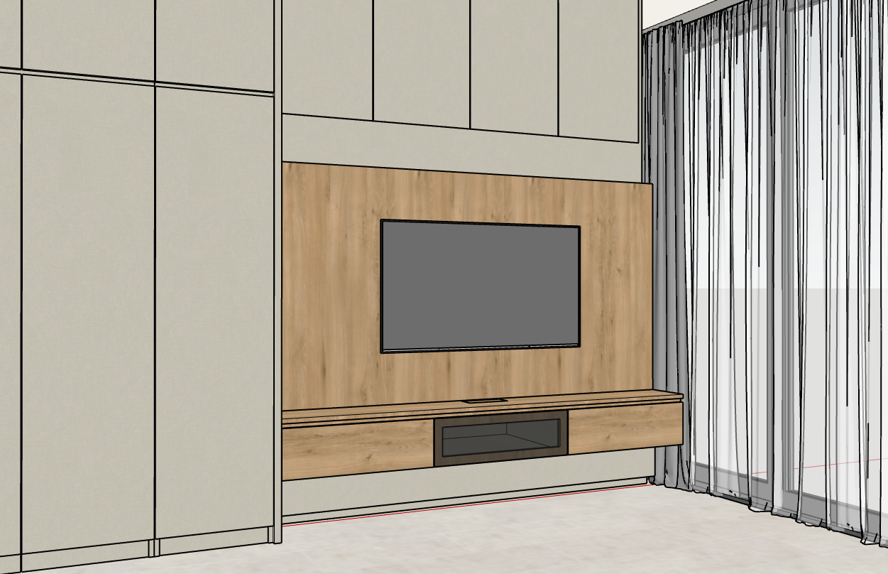 light marble flooring soft daylight from sliding doors on the right no interior light led strip light above tv wood panel led strip light below suspended tv console