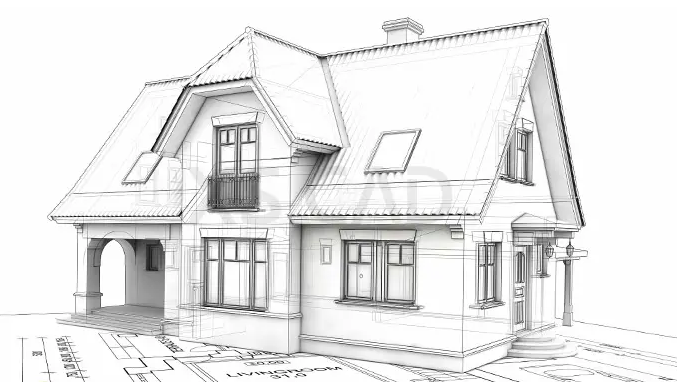 create a sketchy colored rendering of the attached image give it real life exterior wall wood wall patterns and add people waling at the front of the house add nature in the background and a clear blue sky architecture