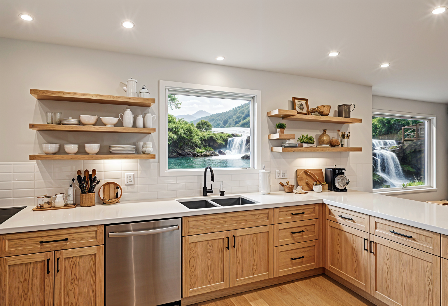 render a modern kitchen with a cozy atmosphere feature light oak wooden cabinets and floating shelves with neatly arranged white ceramic dishes cups and a bowl use black metal handles on the cabinetry the countertops should be a clean bright white complemented by a stainless steel dishwasher the splashback is composed of glossy white subway tiles include a black matte faucet over a double basin sink the room is softly lit with recessed ceiling lights and natural light streams through large windows add hints of greenery with small potted plants on the shelves keep the original window background