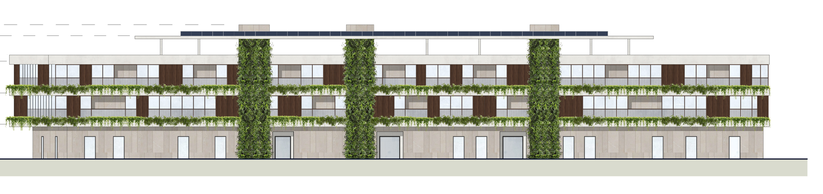 make a realistic render view adding trees and urban furniture such as benches and street lamps