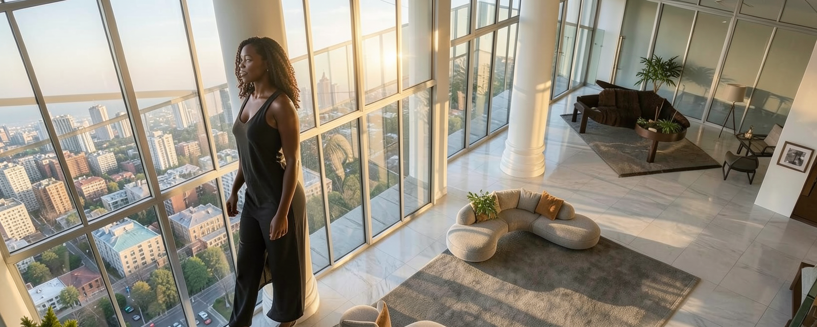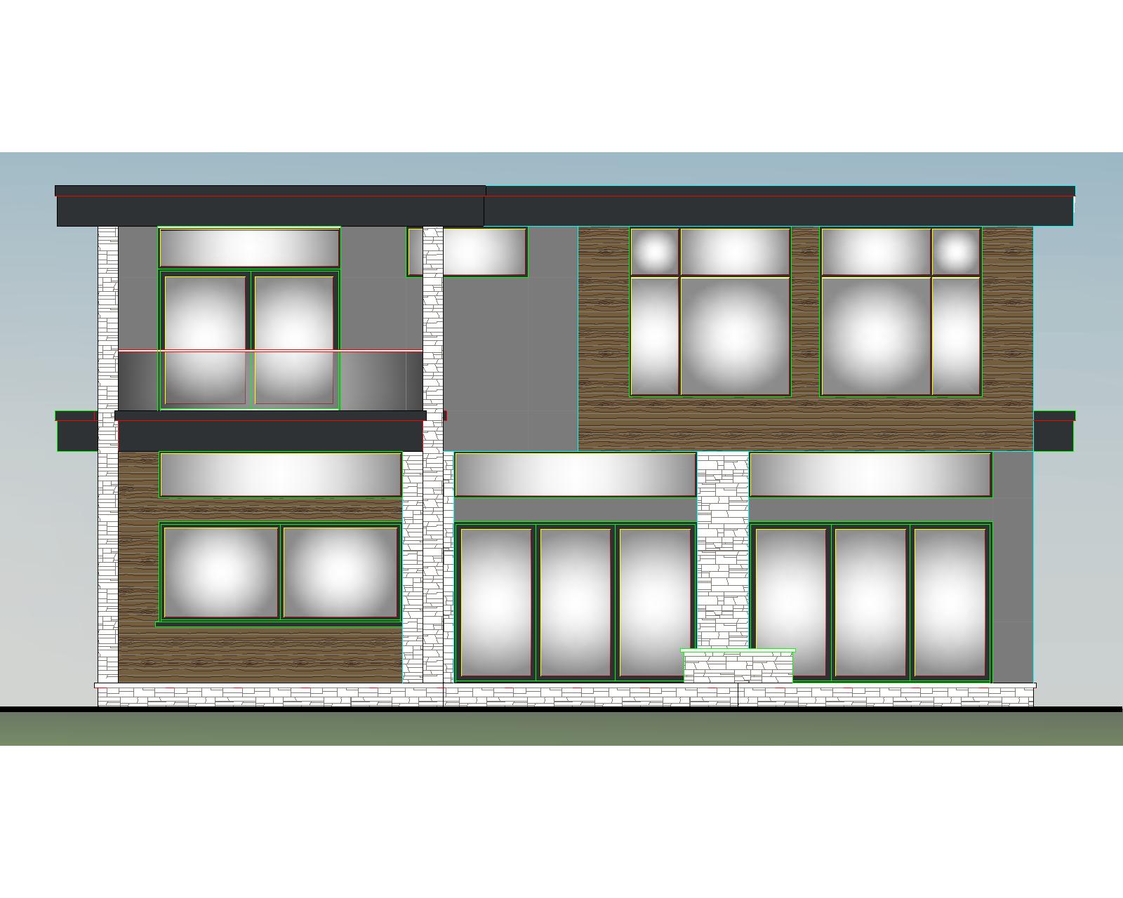 render a modern two story house with a flat roof the upper section features rich wooden panels in a warm walnut brown the lower section is adorned with sleek gray stone in a polished slate color accented with white stacked stone pillars for contrast large windows creating an inviting ambiance the left hand side of the house features a deep covered porch with glass guardrails and a patio beneath create an elegant patio with a fire pit in the middle and set the scene under a clear blue sky giving a fresh and peaceful atmosphere the grade falls away sharply in the foreground with a set of stone steps going to the lake